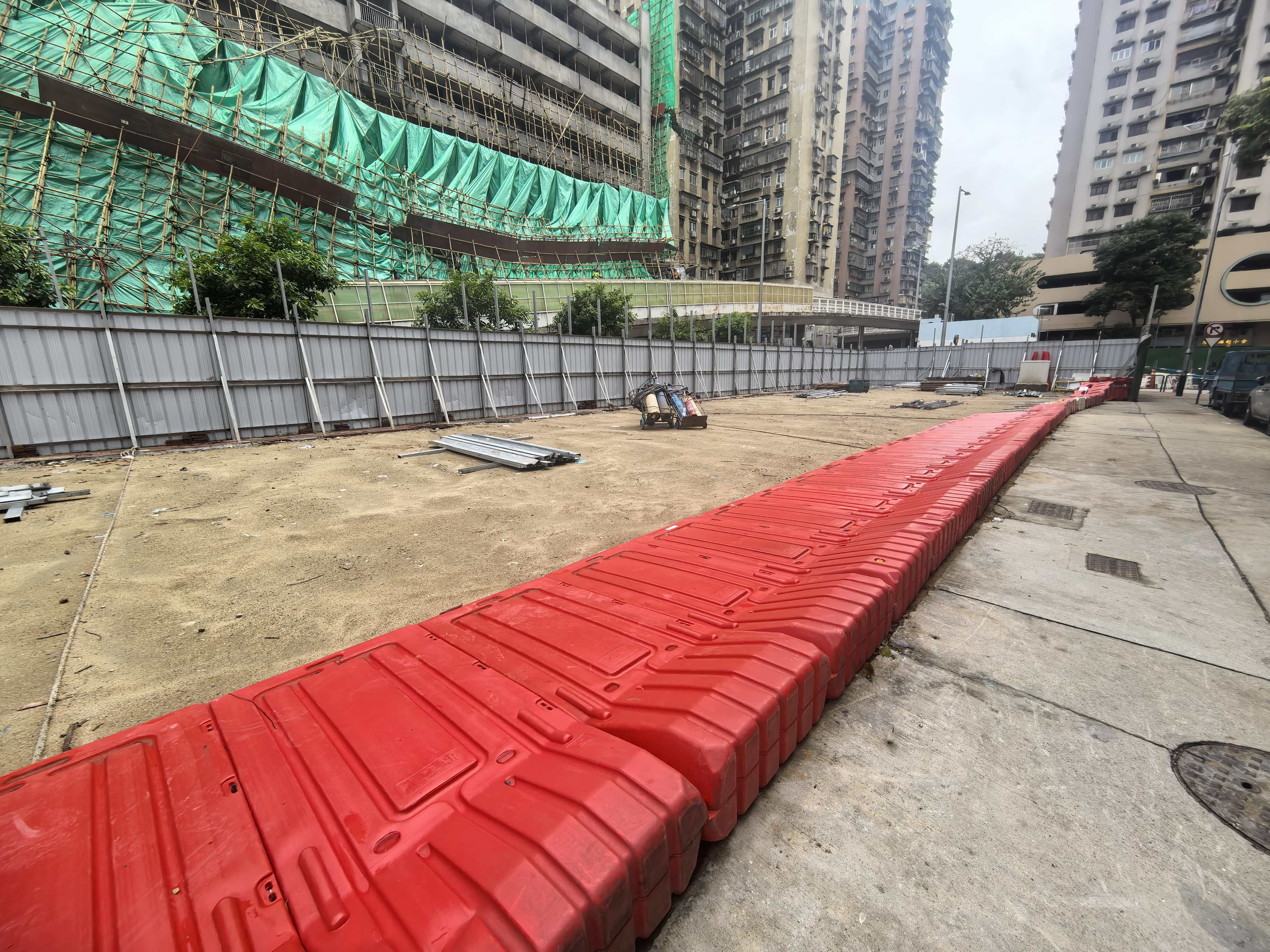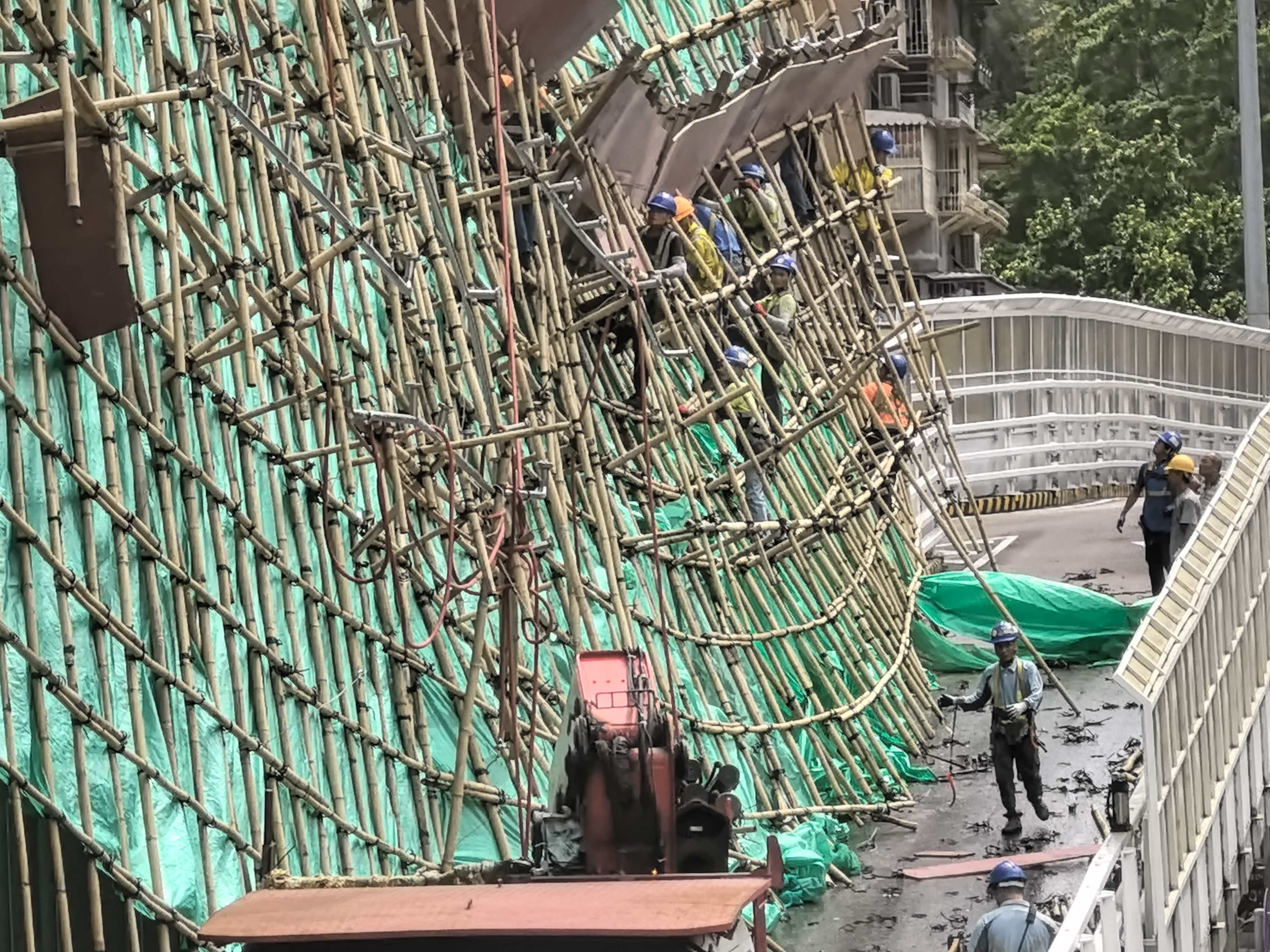 另外,台山嘉翠麗大廈外牆的竹棚在大風中被吹到摇摇欲墜。部分更跌在下面的行車天橋,工人正在搶修中。