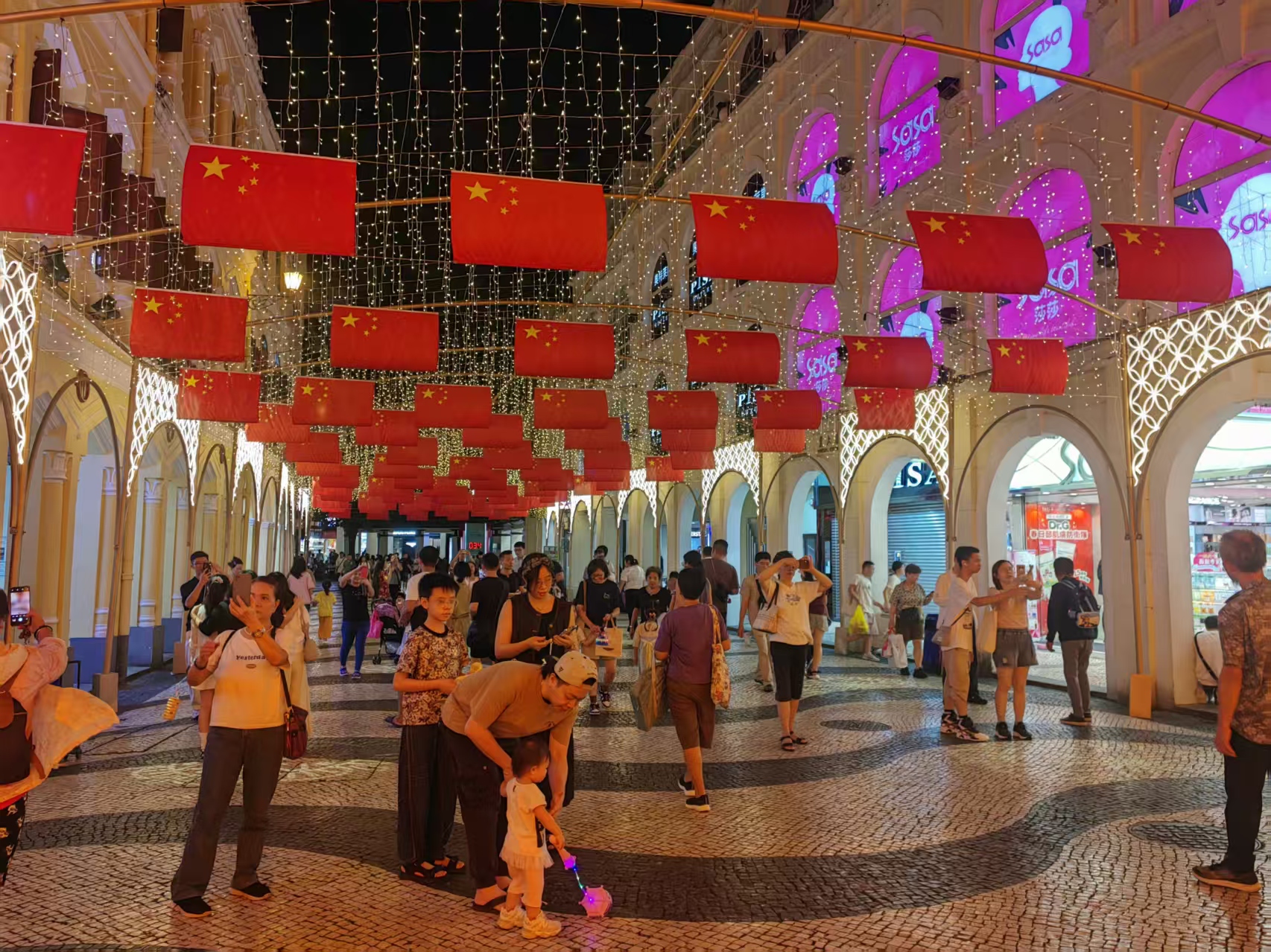 傍晚,本澳大街小巷的燈光亮起,各處中秋主題裝飾吸引了不少市民駐足觀賞,尤其是新馬路議事亭前地璀璨的燈光,吸引大批市民及旅客攜同一家大細到場遊玩、拍照打卡,現場人頭湧湧。有居民周小姐表示,晚上一家人相聚一起吃團圓飯,飯後與小朋友到戶外賞月及玩燈籠,希望讓小孩能感受傳統節慶氣氛。