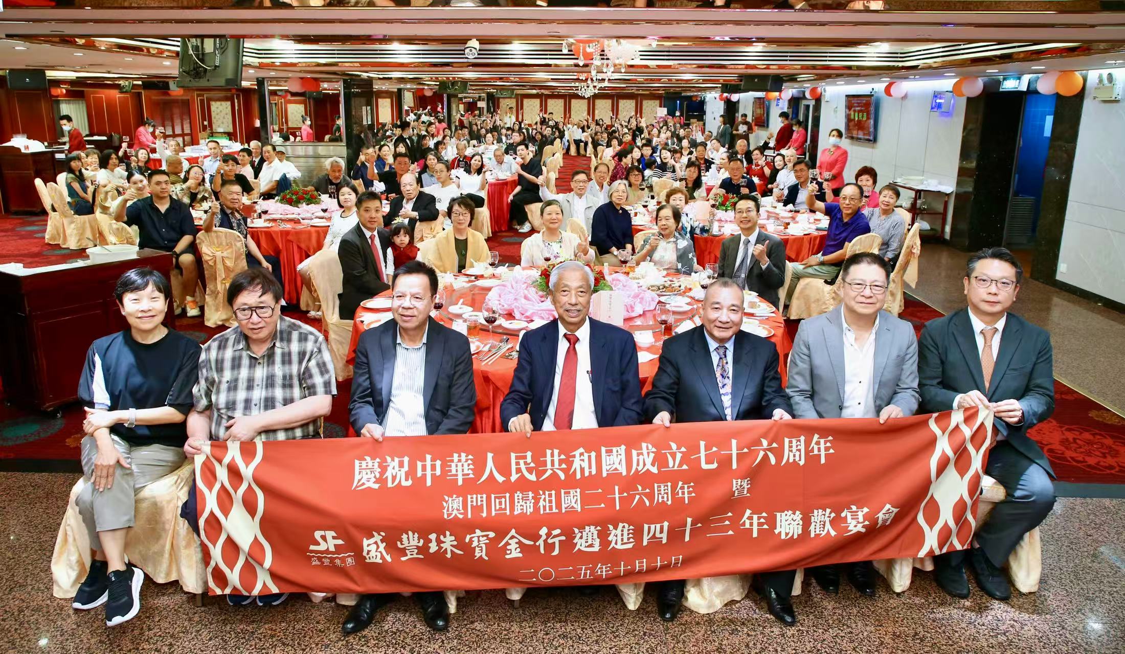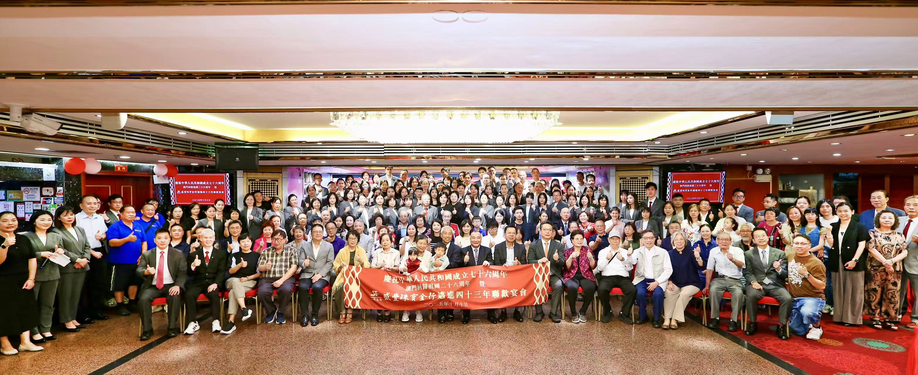 【即時新聞】盛豐珠寶集團昨晚假聯邦大酒樓舉辦“慶祝中華人民共和國成立76周年、澳門回歸祖國26周年暨集團邁向43周年“聯歡晚宴。集團董事長李子豐、副董事長黎碧儀、總經理李居仁、副總經理李居元、營運總監李居明等管理層,與來自澳門、香港、珠海三地的近200名員工及受邀嘉賓歡聚一堂,共慶多重盛事。