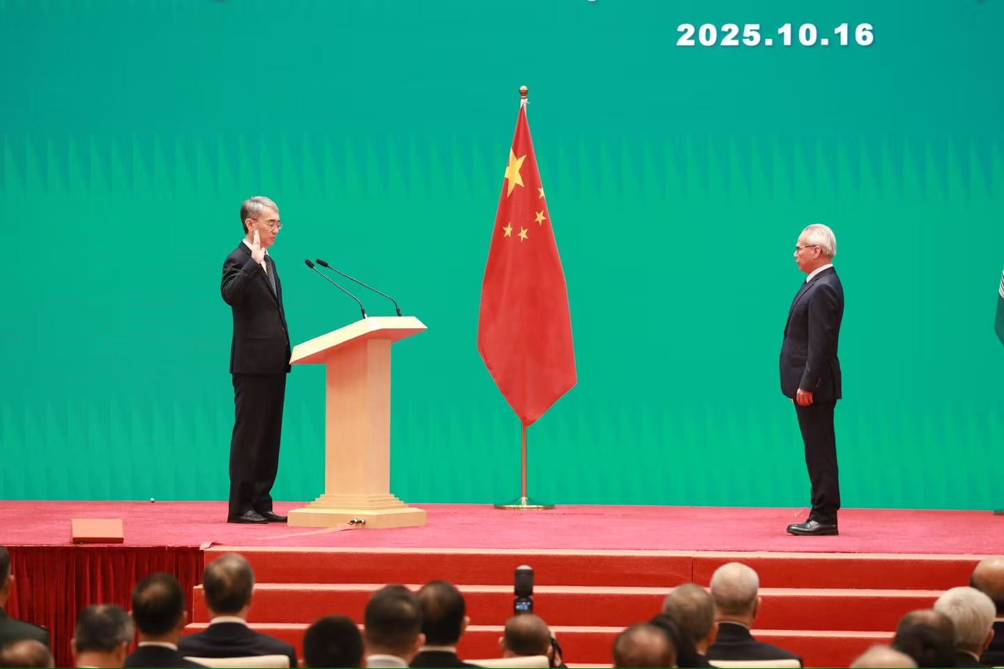 【即時新聞】第八屆立法會首次全體會議下午三時舉行,以全票通過原行政法務司司長張永春為新一屆立法會主席。下午四時,全體議員移師中葡平台綜合體出席第八屆立法會主席宣誓就職儀式,由行政長官岑浩輝監誓。