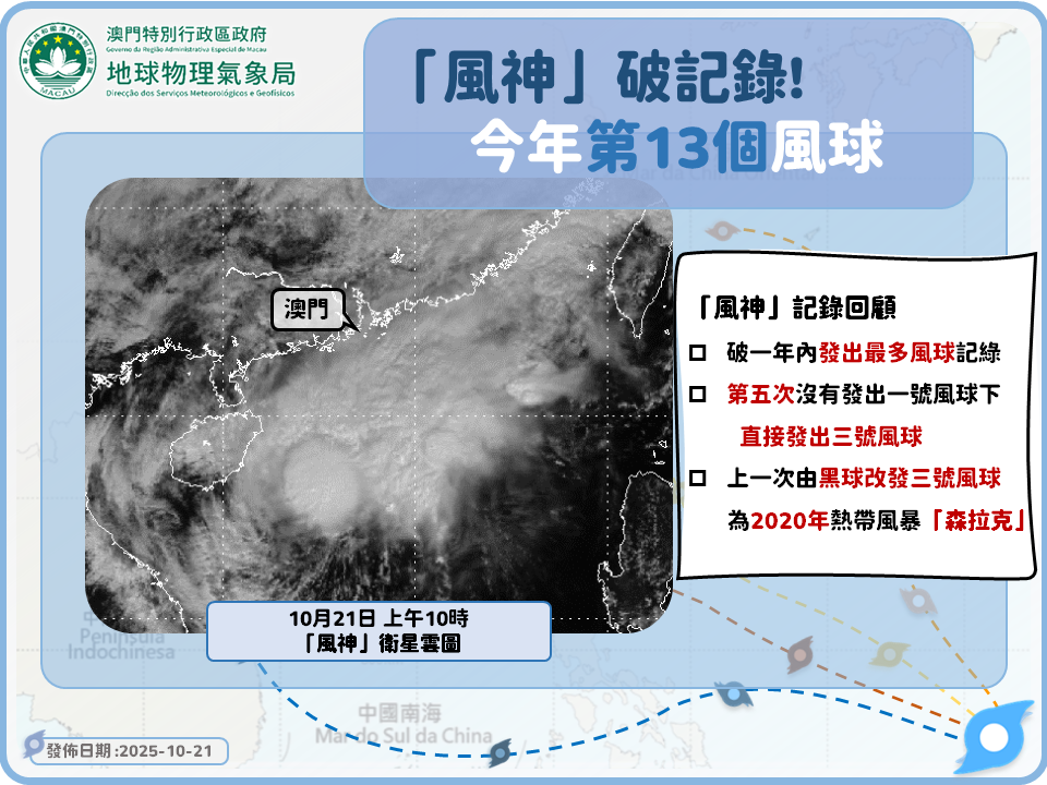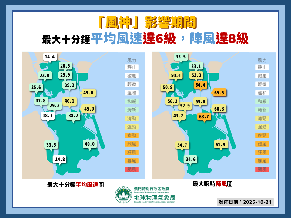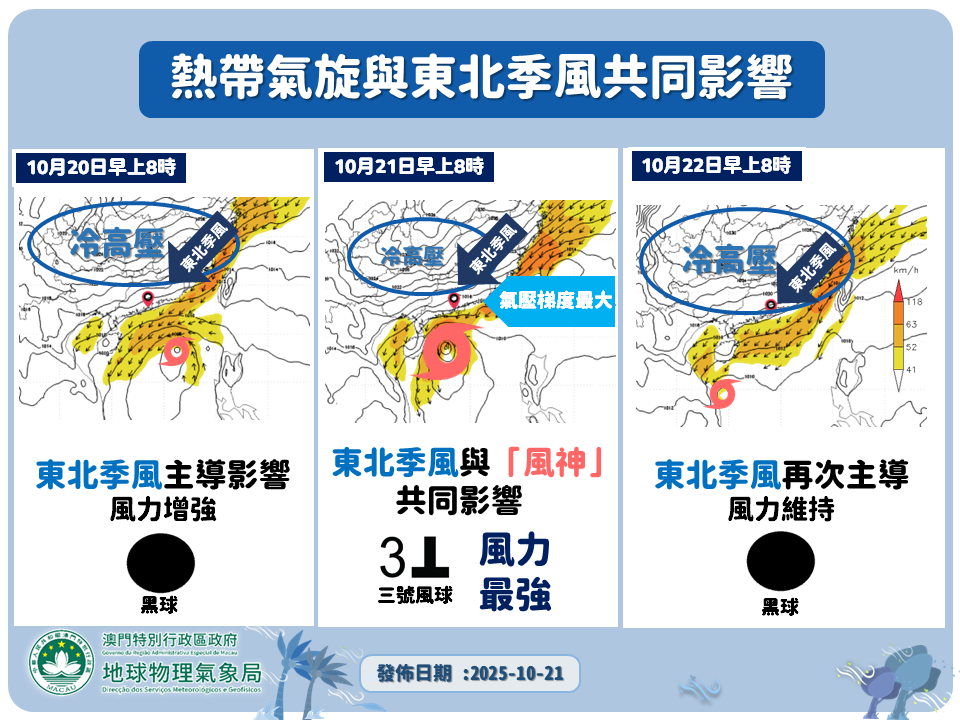 回顧是次過程,由於一股較強的東北季風先行南下,華南沿岸地區氣壓梯度加大,風力增強,因此氣象局先行發出黑球;當「風神」橫過南海中北部,與東北季風共同影響下,華南沿岸氣壓梯度進一步加大,風力進一步增強,其環流對本澳的影響亦有所增加,因此氣象局直接改發三號風球;隨著「風神」遠離,華南沿岸氣壓梯度有所緩和,因此氣象局再改發黑球。
