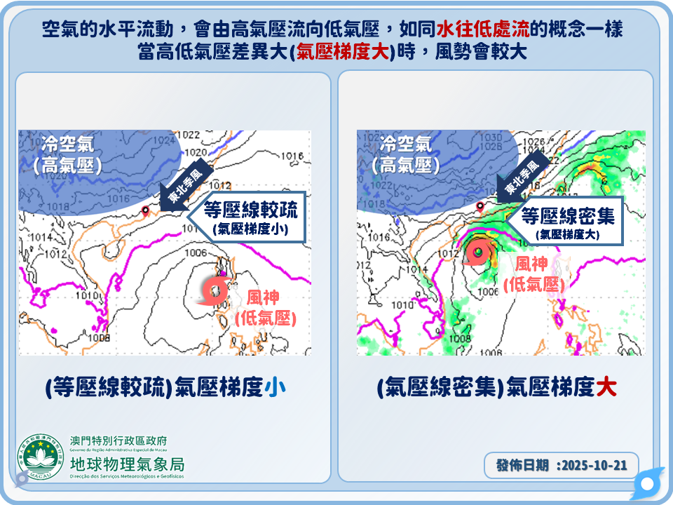 風力的影響是取決於氣壓梯度的大小,俗語說水往低處流,同樣地空氣亦會由高氣壓流向低氣壓,當氣壓差異越大(即氣壓梯度越大,地面氣壓圖上會見到氣壓線變得密集),表示風力越大。
