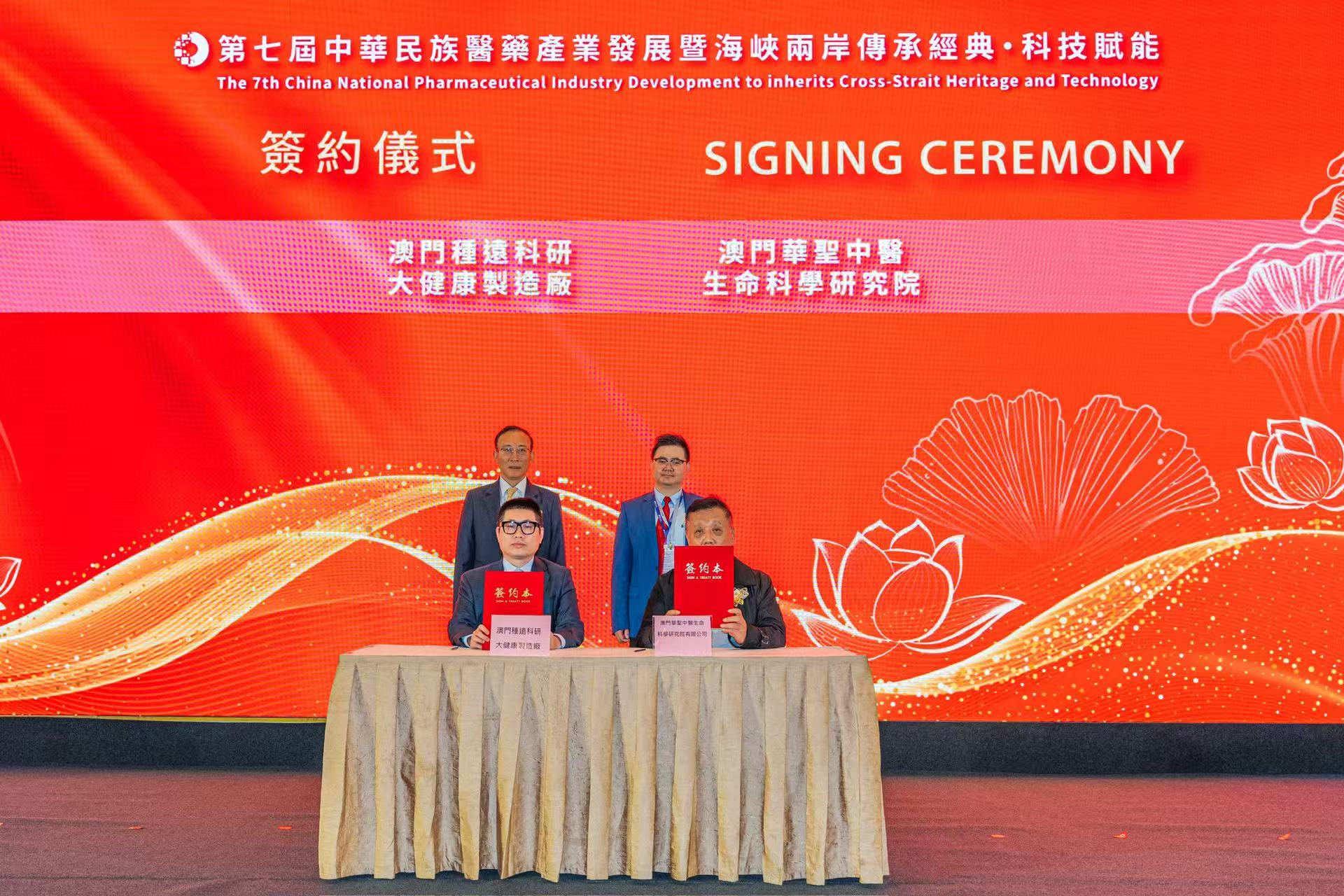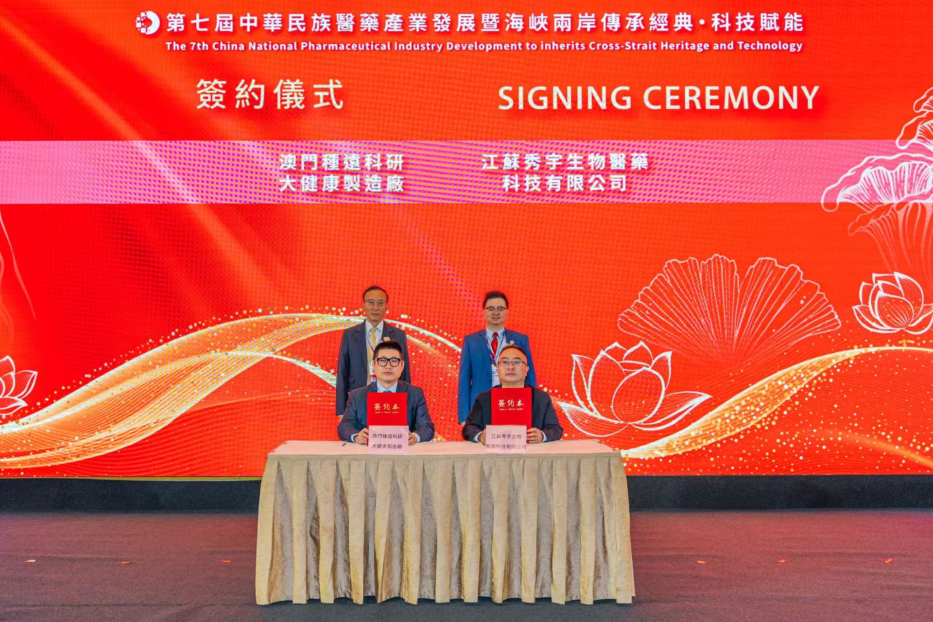 論壇期間還舉行了簽約儀式,澳門種遠科研大健康製造廠和澳門華聖中醫生命科學研究院以及江蘇秀宇生物醫藥科技有限公司達成合作協議,為推動中港澳大灣區中醫藥合作建設優秀案例。