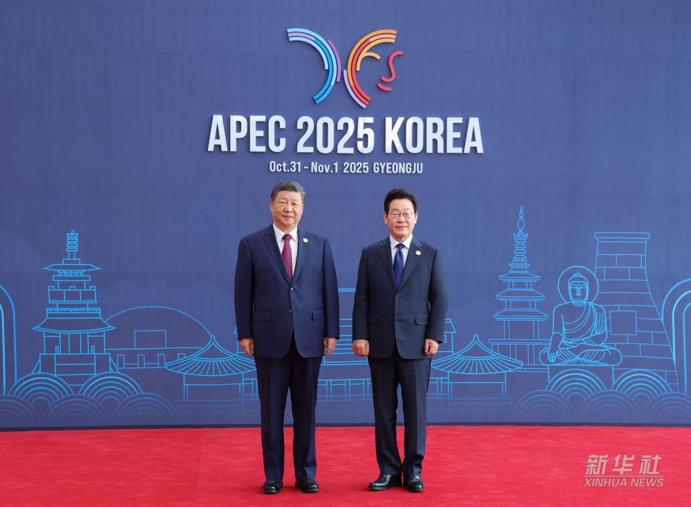 習近平抵達會場時,韓國總統李在明熱情迎接。