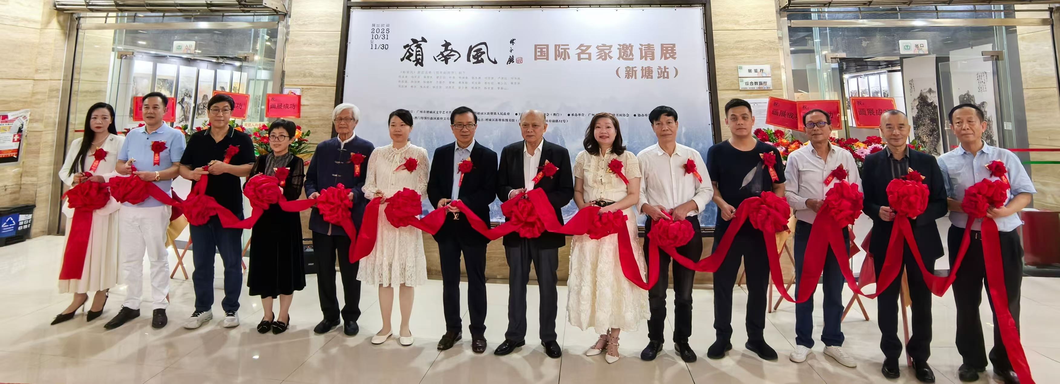 展覽開幕儀式昨日上午舉行,邀得增城區新塘鎮副鎮長易穎、公共服務辦科教文組主任崔利立,廣州市國畫協會會長朱永成,澳門文學藝術界聯合會主席梁晚年,春睡畫院副院長、亞洲藝粹會(澳門)會長梁少美,中山市美協主席黎柱成,增城區書畫協會主席鄒俊豪,增城區美術家協會副主席鍾廣恩,澳門硬筆書法家協會會長歐志祺,新塘書畫協會會長歐陽素熙、常務副會長鍾志賢,香港南天畫會會長盧清遠,歐亞通匯貨幣兌換公司董事長李繼,新塘書畫協會副會長兼秘書長劉桂珍共同主持剪綵儀式。易穎、朱永成、梁少美及歐陽素熙先後致辭,對展覽的成功舉辦表示祝賀,並向參展名家、嘉賓以及長期支持嶺南藝術發展的文化同道致以誠摯謝意。