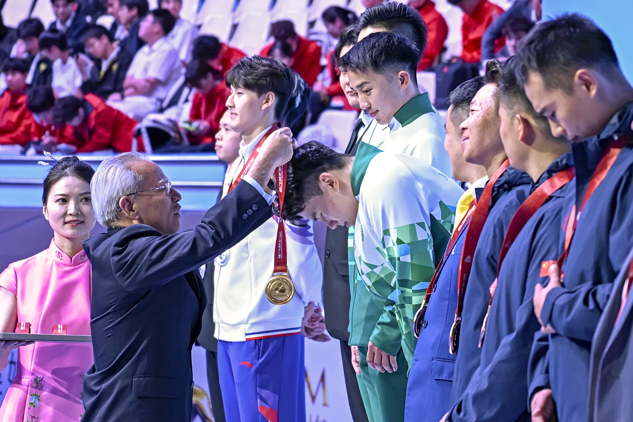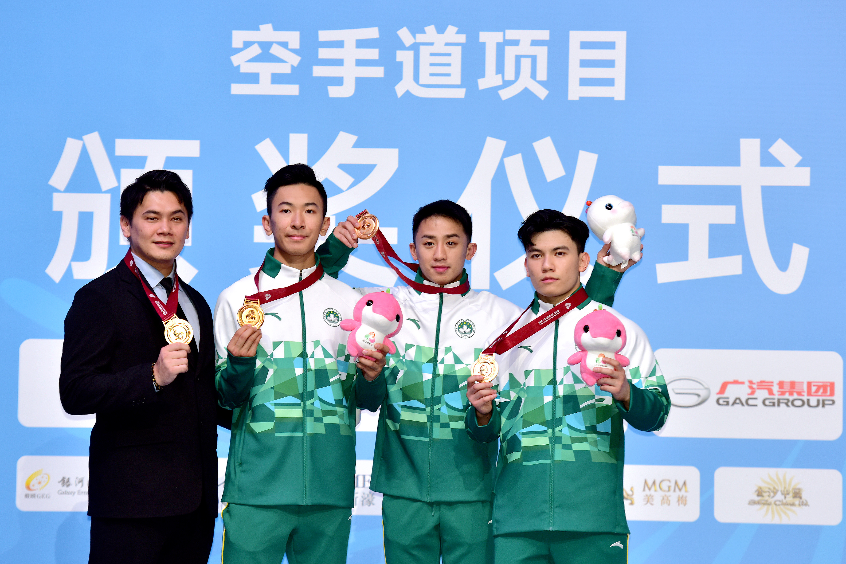 【即時新聞】『第十五屆全國運動會』今(6)日在澳門賽區進行空手道項目,坐擁主場優勢的澳門隊首日比賽即傳來喜訊,郭建恆(KUOK KIN HANG)繼2021年西安全運會勇奪個人型銅牌,為澳門奪得歷史性獎牌後,今屆夥拍隊友鄭沘珞(CHEANG PEI LOK)及方文浩(FONG MAN HOU)在男子組團體型再造出好成績,決賽以42.7分擊敗香港隊摘金,為澳門參加全運會以來首面金牌。澳門特別行政區行政長官岑浩輝出席頒獎禮,親自為澳門運動員頒發獎牌。