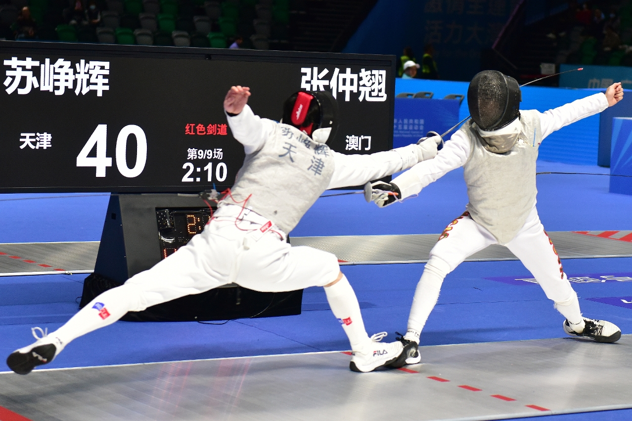 劍擊賽事方面,澳門隊先後派出張仲翹(CHEONG CHONG KIO)、林柏翹(LAM PAK KIO)、胡頌謙(WU CHONG HIM)、許文傑(HOI MAN KIT)出戰男子花劍團體賽,16強面對天津隊,9場比賽中以隊員張仲翹(CHEONG CHONG KIO)拿到最多局分,惜最終以總分30比45不敵對手,未能晉級。