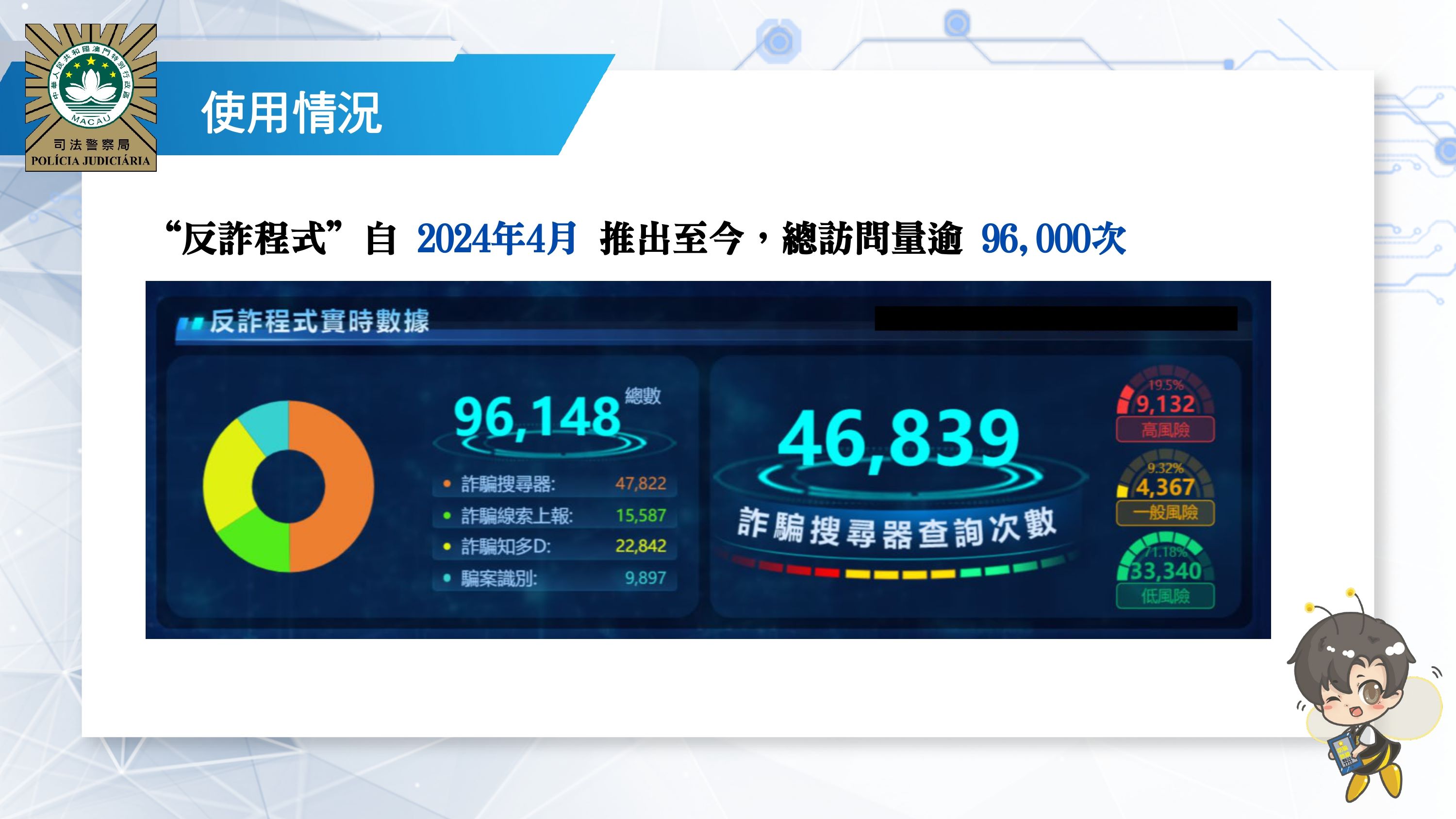 【即時新聞】司警局將於明天(21日)正式推出反詐程式的優化版本,新增關愛模式、圖片上傳等三大功能。原程式在2024年已成功攔截高風險詐騙9,000次,接收市民線索4,600餘條,累計9萬用戶使用。根據司警局公布數據,反詐程式在2024年運行期間表現亮眼,為警方預警和偵查工作提供重要支持。