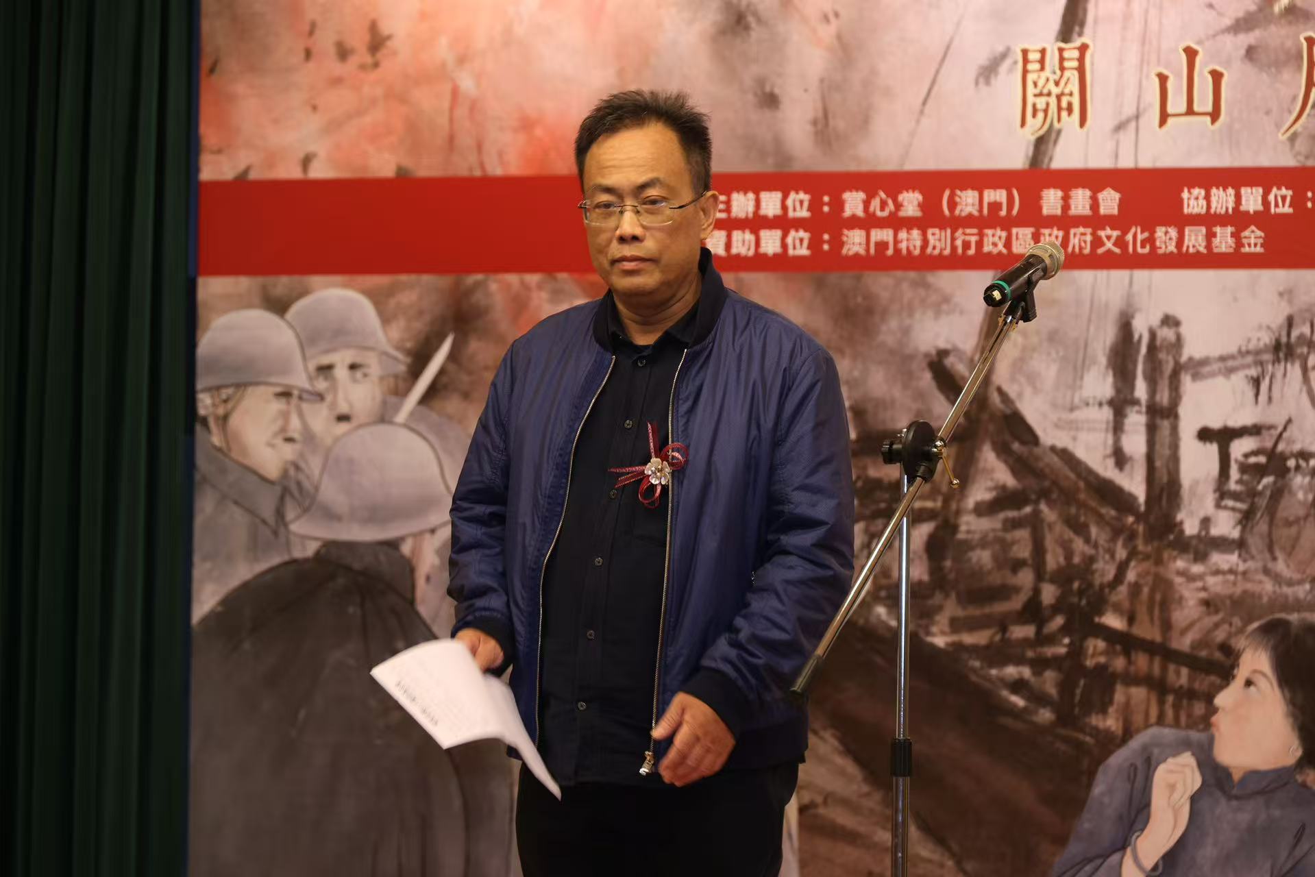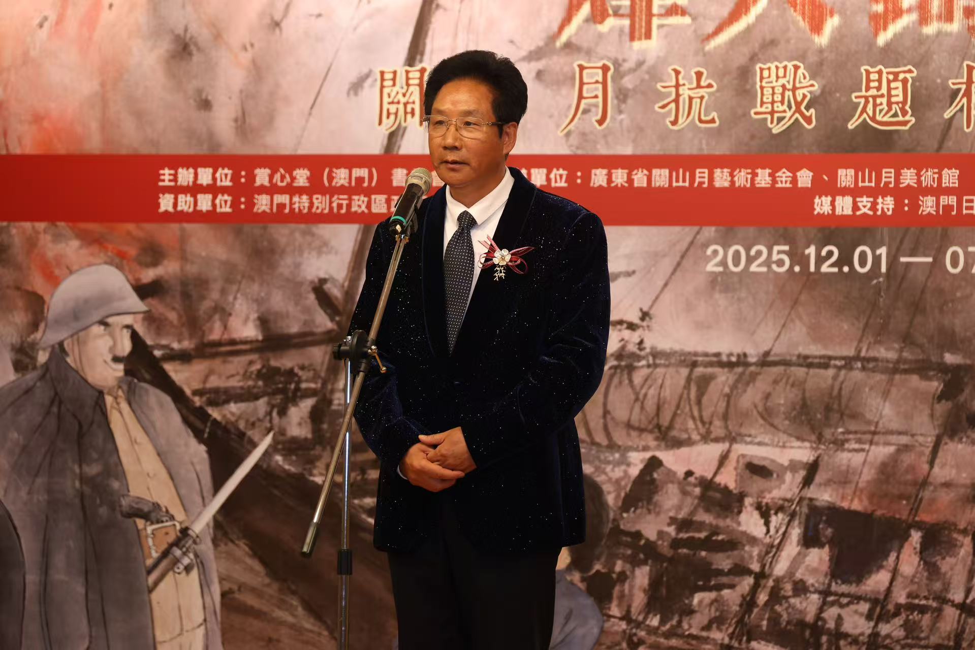 現場,陳俊宇宣讀關山月女兒關怡的賀信。信中深情表示,今年是抗戰勝利80周年,昔日畫筆下烽火連天的戰場,如今已化作安居樂業的錦繡家園。然而,流淌於關山月抗戰題材作品中的民族精神,並未因歲月流轉而褪色。當觀者凝望畫中壯麗山河,感受其中的凌雲氣勢,既能看到一位藝術家畢生的藝術追求,更能看到一個古老民族歷經血與火的洗禮後,煥發出的頑強生命力與開創未來的蓬勃氣象。關怡在信中感謝特區政府兩度為她父親在澳門中總辦展(1996年及2025年),也感謝劉富業為她父親在澳門開展藝術研究,寫下達15萬字的博士論文,為推廣與深化其父藝術成就作出寶貴貢獻。