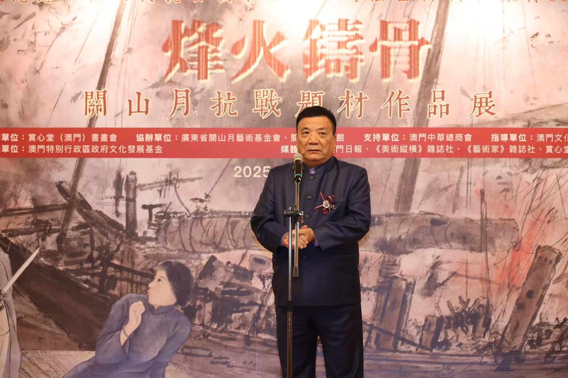 劉富業在致詞中深情緬懷恩師關山月,高度讚揚其對澳門文化藝術發展所作出的重要貢獻,以及對整個嶺南畫派產生的深遠影響。他指出,在紀念中國人民抗日戰爭暨世界反法西斯戰爭勝利80周年的重要歷史節點舉辦此次畫展,不僅是對先輩藝術家愛國情懷與時代擔當的致敬,更具有深刻的歷史意義與廣泛的國民教育價值,有助於弘揚抗戰精神、厚植愛國情懷,激勵今人銘記歷史、珍愛和平、開創未來。