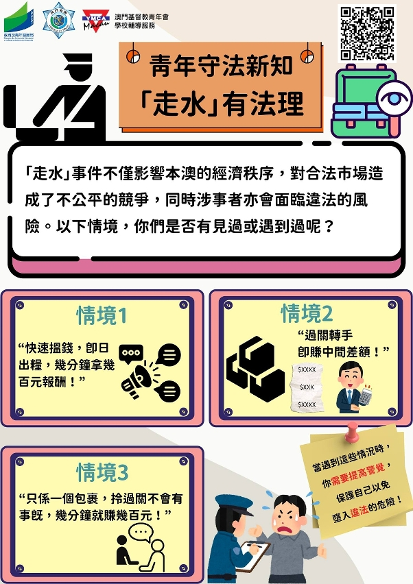 【即時新聞】隨著長假期臨近,為進一步增強青少年自我保護意識,教育及青年發展局與澳門海關緊密合作,在關閘口岸一帶聯合開展宣傳教育工作,為跨境往來的青少年及其家庭送上長假期安全“錦囊”,透過法律條文解讀、案例簡介等方式,清晰闡明“走水貨”等不法行為所帶來的嚴重法律後果及對個人前程的影響,引導青少年樹立正確價值觀、遠離不法活動,並提醒家長多留意子女行為、關心子女假期動向,及時作出適當的指導與教育。