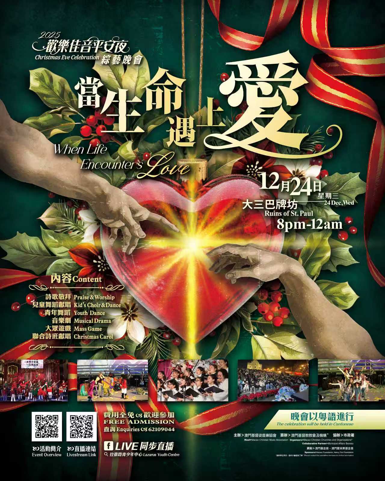 【即時新聞】由澳門基督徒音樂協會主辦,十多個基督教教會及機構聯合籌辦,市政署協辦,澳門基金會、澳門霍英東基金會資助之「2025歡樂佳音平安夜」綜藝晚會,定於本年十二月廿四日(星期三),平安夜晚上八時至十二時假大三巴牌坊耶穌會廣場舉行。
