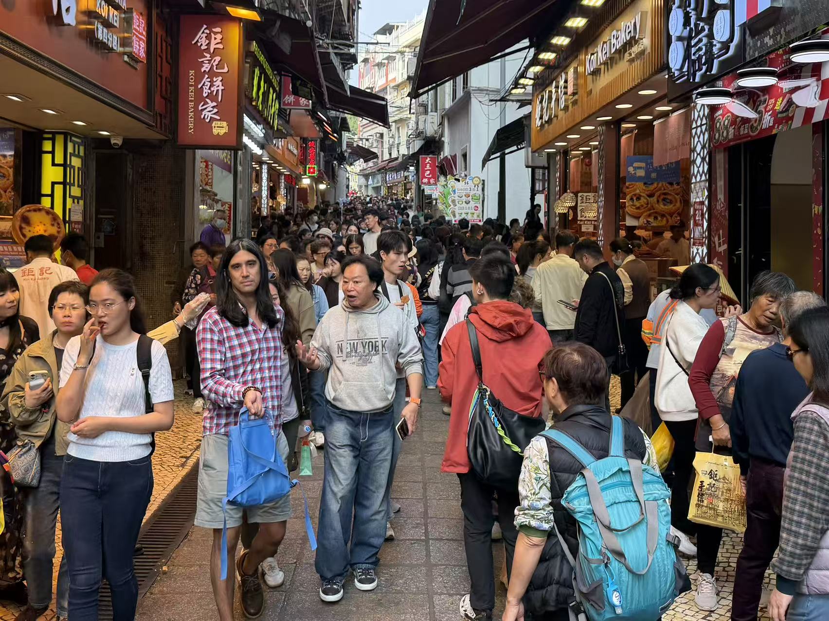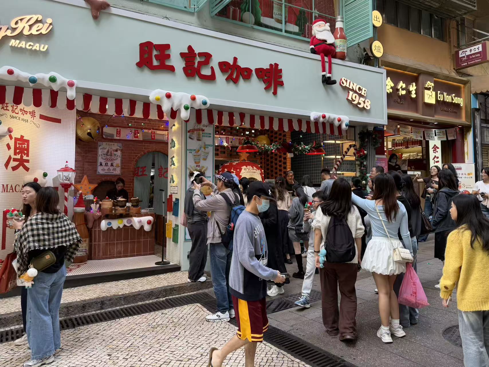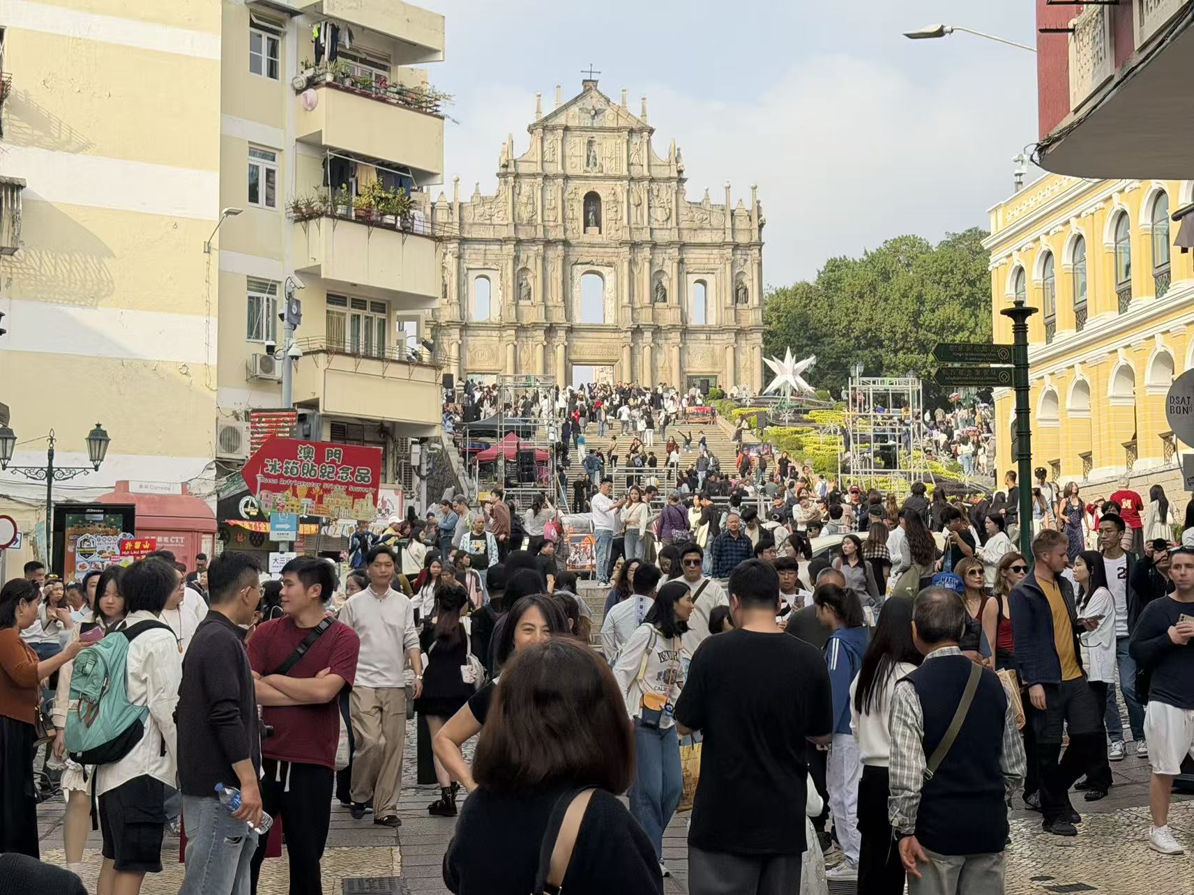 假日裡的景區氣氛熱鬧,旅客絡繹不絕,大三巴附近手信店客流也有增多,店員們不停地遞送試吃。周邊街巷不少商鋪也佈置了許多聖誕裝飾,吸引旅客紛紛駐足。