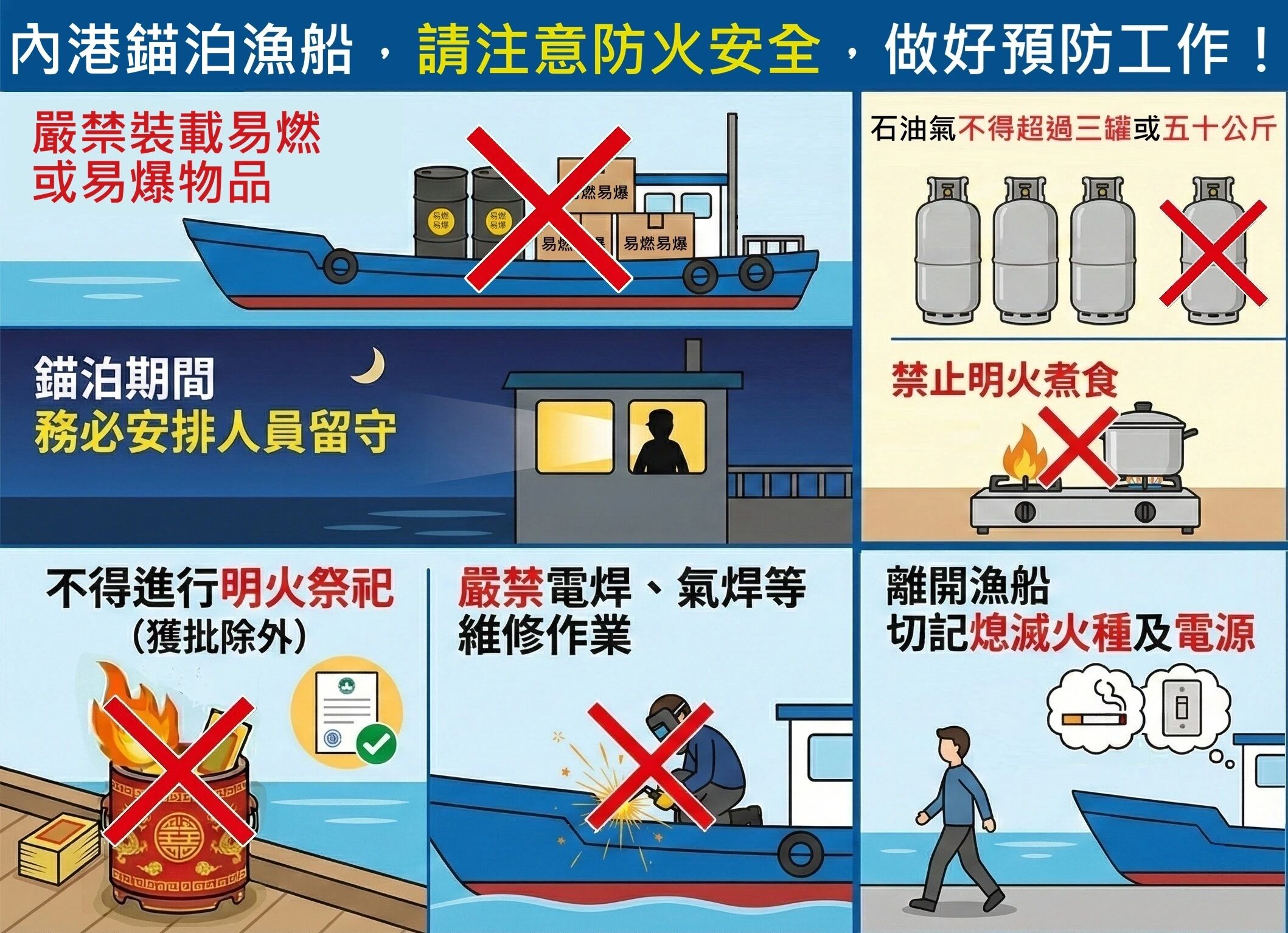 與此同時,漁民須遵守海事及水務局第1/2022號《告示》及第3/2022號《告示》的船舶停泊及航行應遵規則,在內港錨泊漁船上不得裝載超過三罐或五十公斤以上的液化石油氣,並安排人員留守船隻等預防工作。