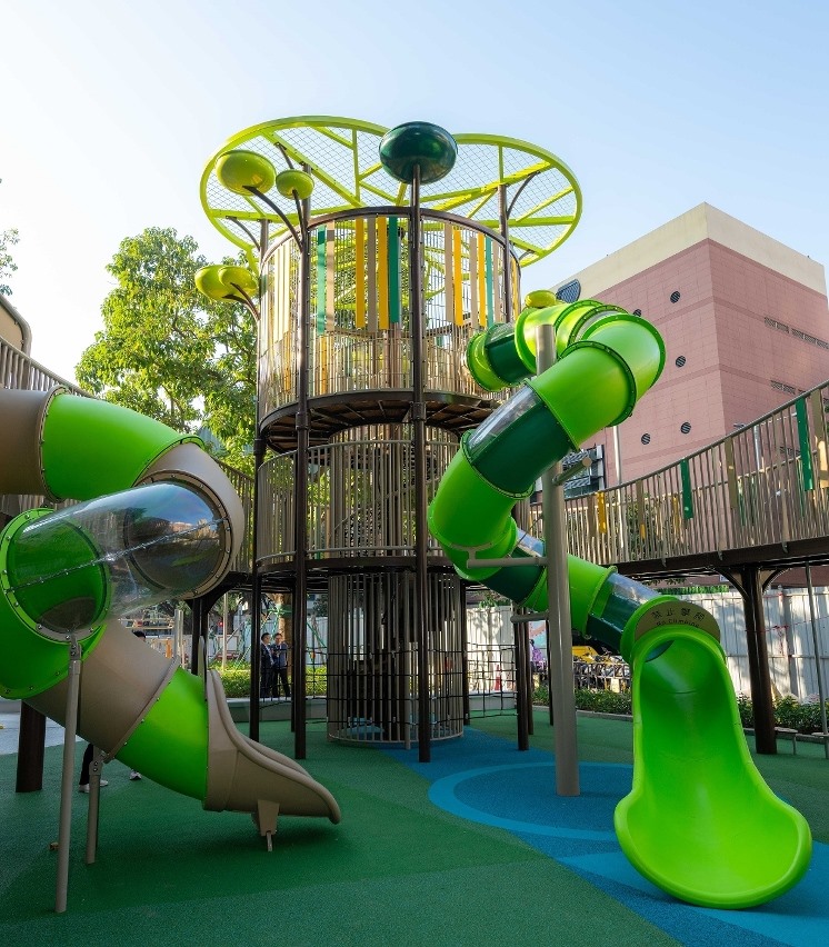 台山中街休憩區,面積約870平方米,設計融合自然元素,保留現有樹木,結合綠化景觀,營造城市綠洲的休閒體驗。因應場地鄰近多所學校,家長及學童使用率高,優化重點針對兒童遊樂區及成人健身區進行升級,增加以樹屋造型的兒童遊具,配置高架探索走道,利用有限的場地空間,向學童少年提供遊樂及探索自然的樂趣,鍛鍊協調性及平衡感,提升體能。同時,重新規劃佈局,優化成人健身區設施,照顧不同年齡層的健身與康體需求。