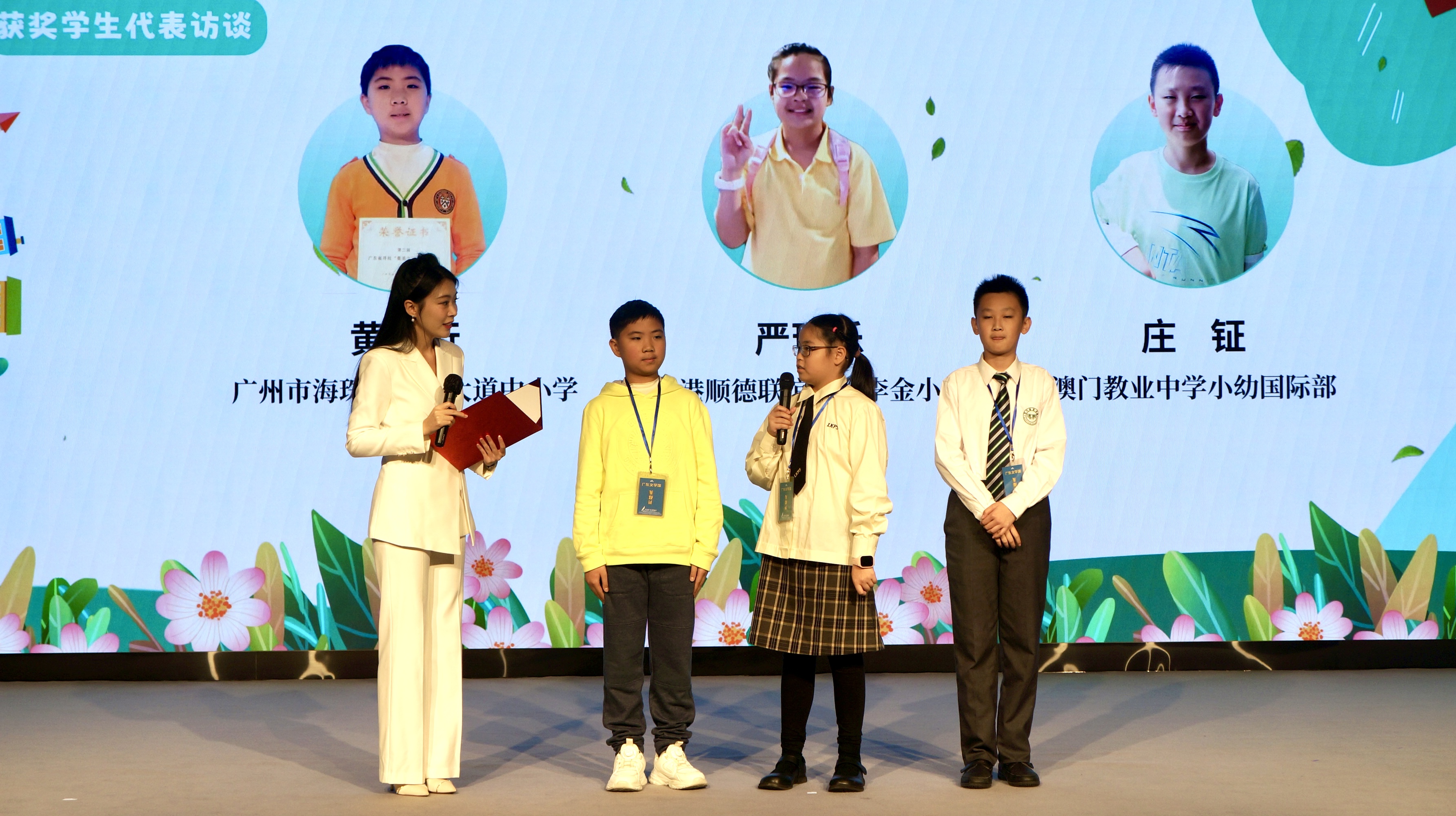 在獲獎學生代表訪談環節,來自廣東、香港和澳門的三位一等獎獲得者分享了各自的創作心得與故事。隨後,三地的優秀指導老師也登台交流,介紹如何引導孩子觀察自然、激發創作靈感的實踐經驗,彰顯了教育工作者在文學啟蒙與生態教育中的關鍵作用。來自教業中學的一等獎獲得者庄鉦同學和老師何慧萍代表澳門與各區代表進行了深入的討論。
