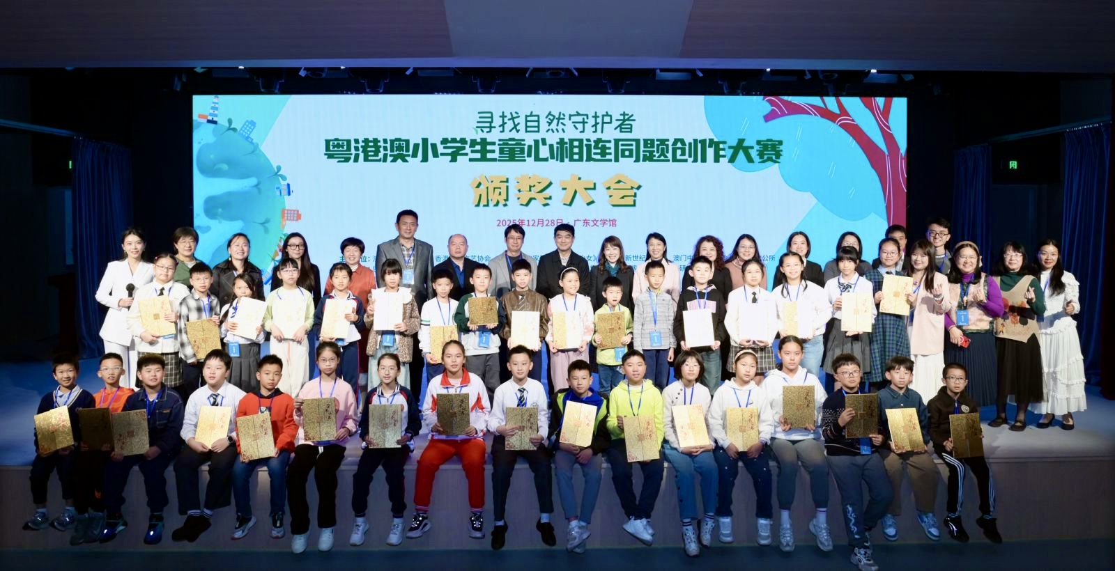 【即時新聞】由粵港澳三地十餘家文化、教育及出版機構聯合主辦的「尋找自然守護」2025粵港澳小學生童心相連同題創作大賽頒獎典禮,12月28日下午在廣州廣東文學館隆重舉行。此次活動匯聚了近兩百名來自三地的教育界和文學界代表及獲獎師生,共同見證這一跨地域的少兒文學盛事。