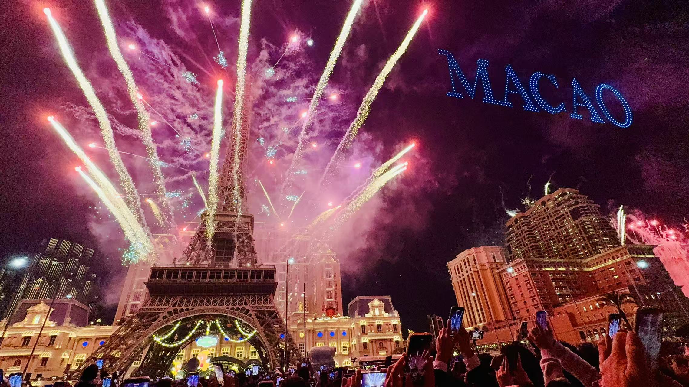 進入倒數階段,澳門巴黎鐵塔率先以耀目光效匯演揭開序幕。隨著萬人倒數聲逐漸臨近,大型煙花匯演將於澳門威尼斯人、澳門巴黎人、澳門倫敦人奪目綻放,吸引眾多市民及遊客到場慶賀,共同踏入新的一年。