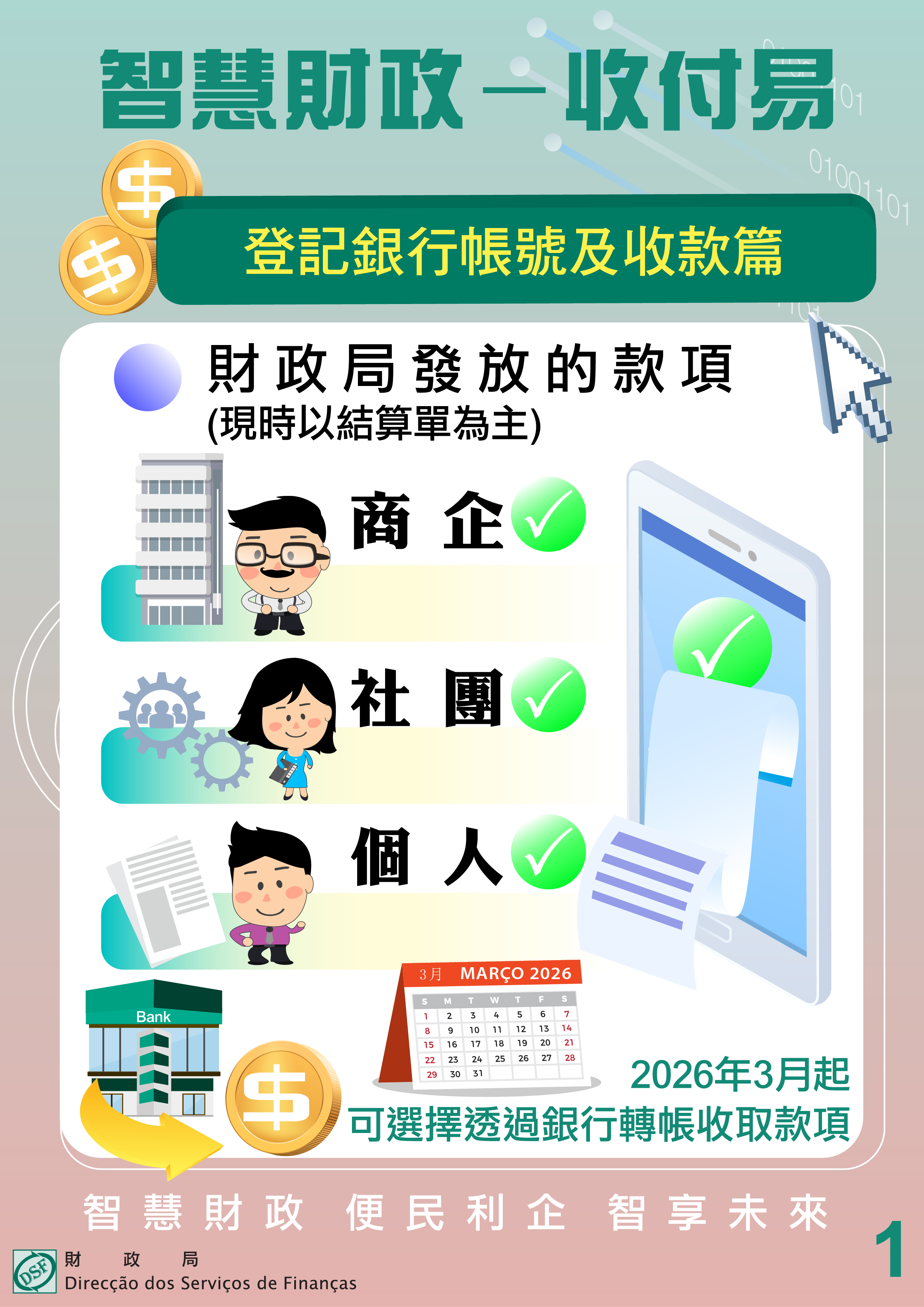 現時,個人、企業及社團收取財政局發放的款項(如貨款、退還保證金、服務費、報酬等),一般須憑結算單親臨銀行櫃檯辦理入帳兌現,手續較為繁複。自2026年1月起,新增收款人可於參與 “收付易”計劃的多間銀行,透過線上或線下方式預先登記收款帳戶。