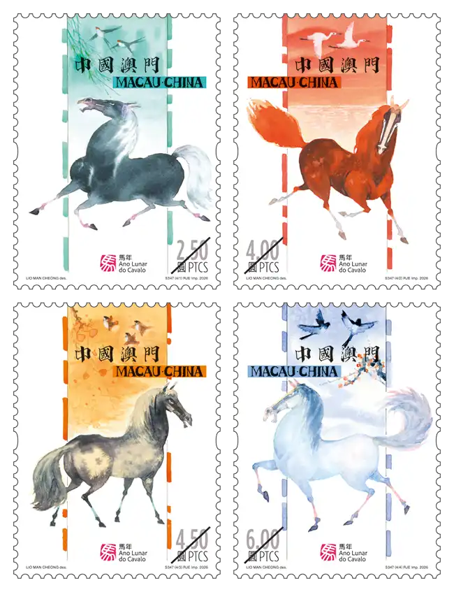 【即時新聞】郵電局將於1月5日發行「馬年」郵品,此為第四輯生肖系列的第七套郵票。是次發行的一套四枚郵票,以水彩手繪生動呈現駿馬風采,既兼具力量與速度,又蘊含昂揚進取的精神。設計上,郵票以四季意象映襯馬匹的各種矯健姿態,運用簡練線條與鮮明色塊,展現馬年的蓬勃朝氣。小型張以八匹不同形態的駿馬組成《八駿圖》,寓意馬到功成、鵬程萬里。該套郵票的圖案由廖文暢設計,資料單張的文本由李觀鼎撰寫。