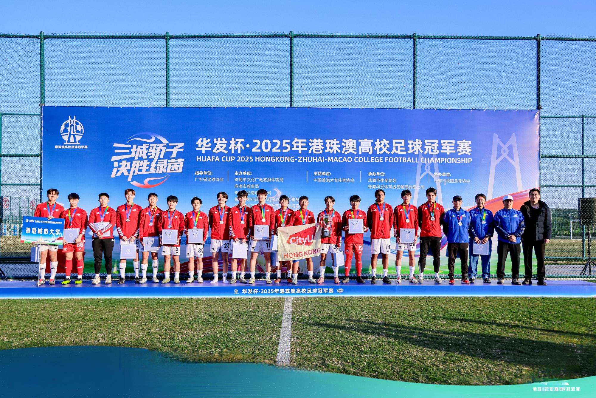【即時新聞】昨日下午,“華發杯・2025港珠澳高校足球冠軍賽”終極對決在珠海市金灣區平沙鎮索卡體育訓練基地熱血收官。經過90分鐘的巔峰較量,澳門大學以2:1的比分力克香港城市大學,成功摘得本屆賽事總冠軍桂冠,香港城市大學斬獲亞軍。北師香港浸會大學與香港大學的三四名決賽同樣懸念拉滿,雙方常規時間戰成2:2平,最終香港大學通過點球大戰以4:3的總比分勝出,奪得季軍。