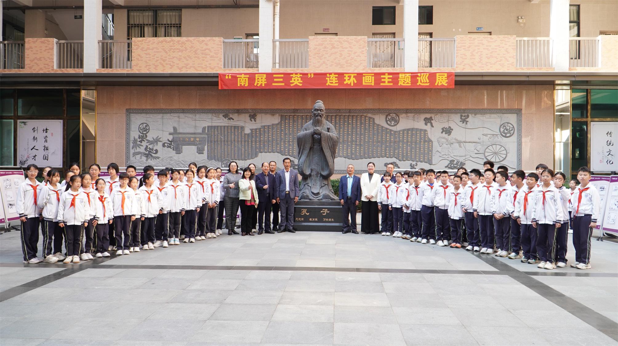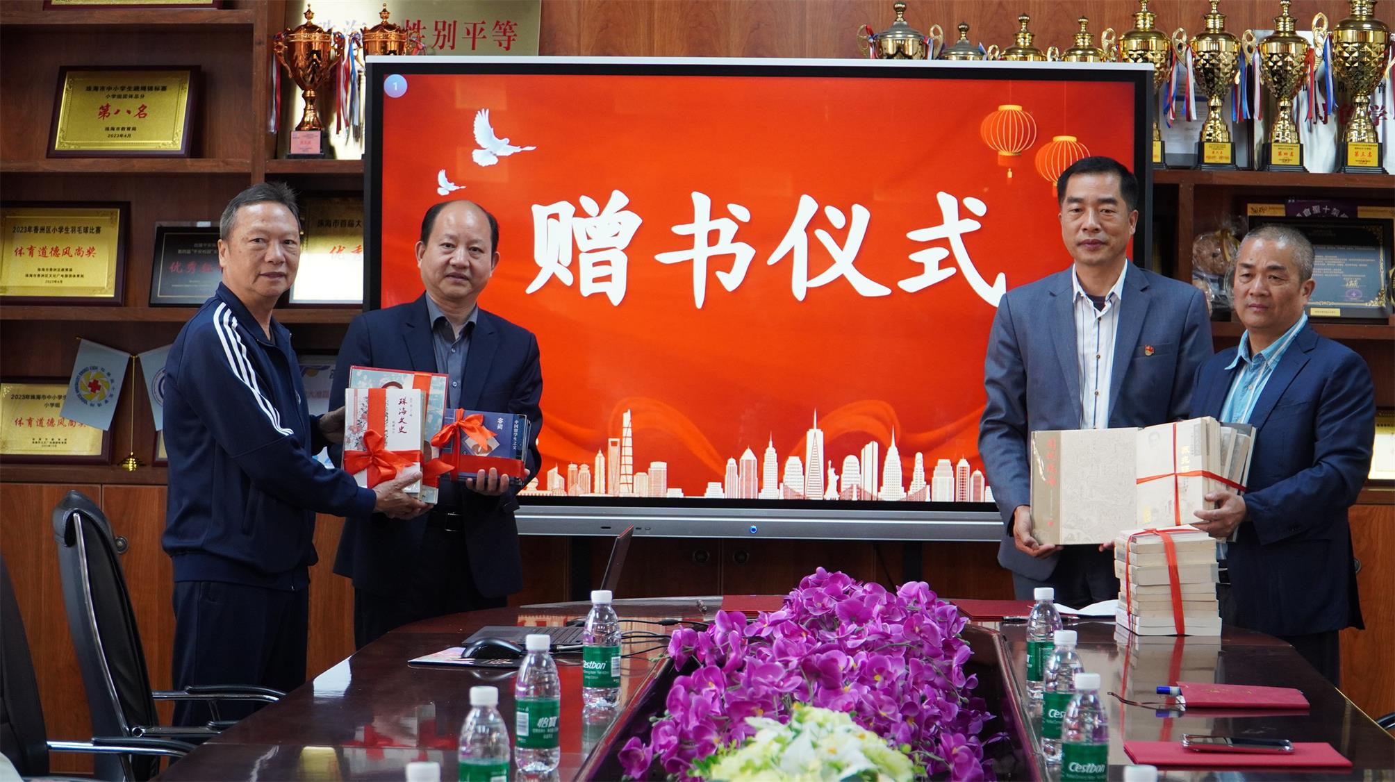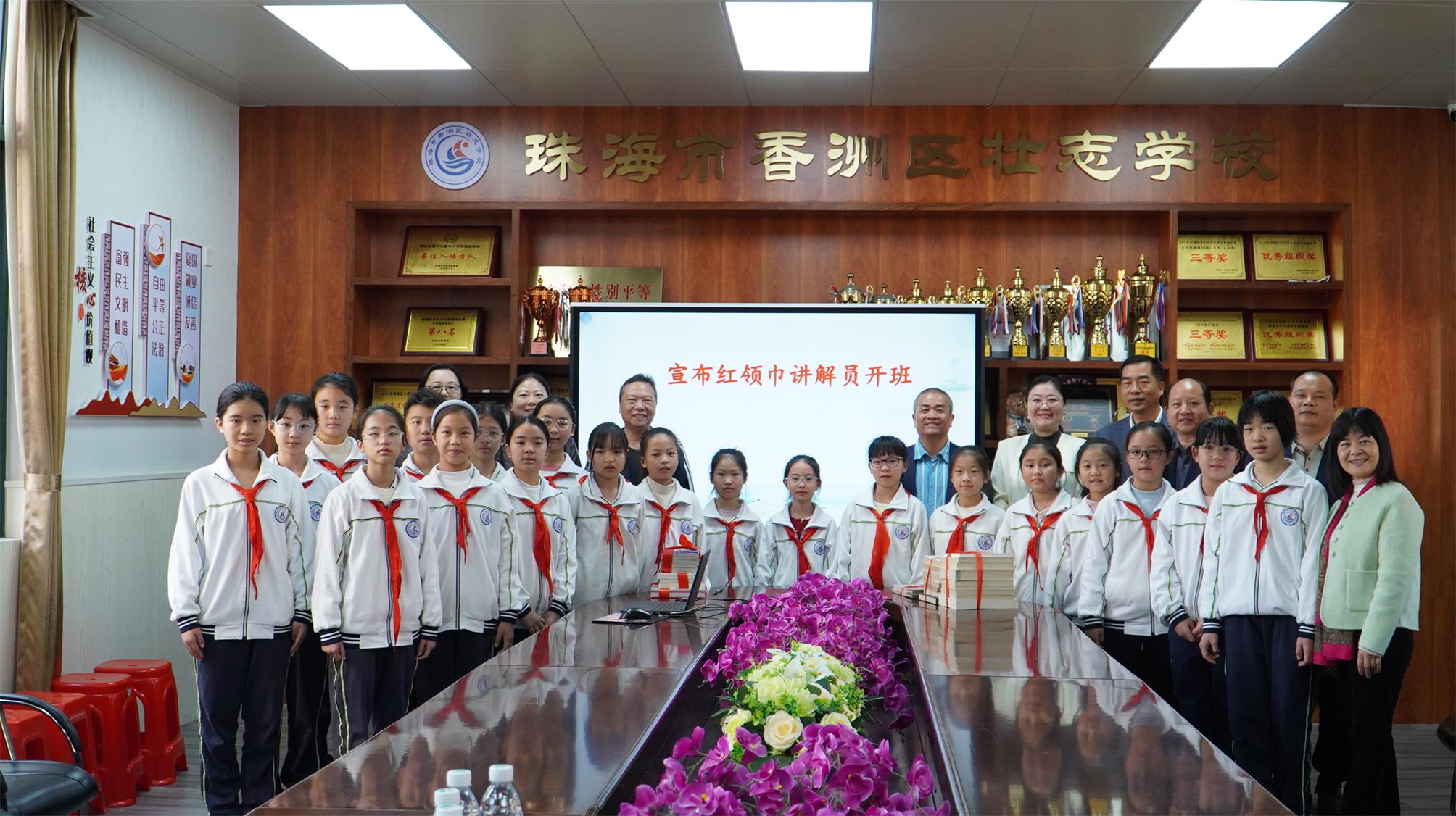 在活動現場,容閎研究會會長楊毅、珠海歷史名人研究會會長吳流芳共同向壯志學校贈送了一批精選的珠海歷史人文社科類書籍,為學校圖書館和閱讀空間注入新的知識養分。贈書活動結束後,現場宣佈學校“紅領巾講解員”培訓正式開班,該項目旨在培養學生講解員,傳承歷史文脈,提升語言表達與社會實踐能力。儀式最後,與會人員在學校紅領巾講解員的引領下,一同參觀了在校園內展出的“南屏三英”連環畫主題巡展,通過生動的藝術形式,感受本土歷史人物的愛國精神與文化魅力。