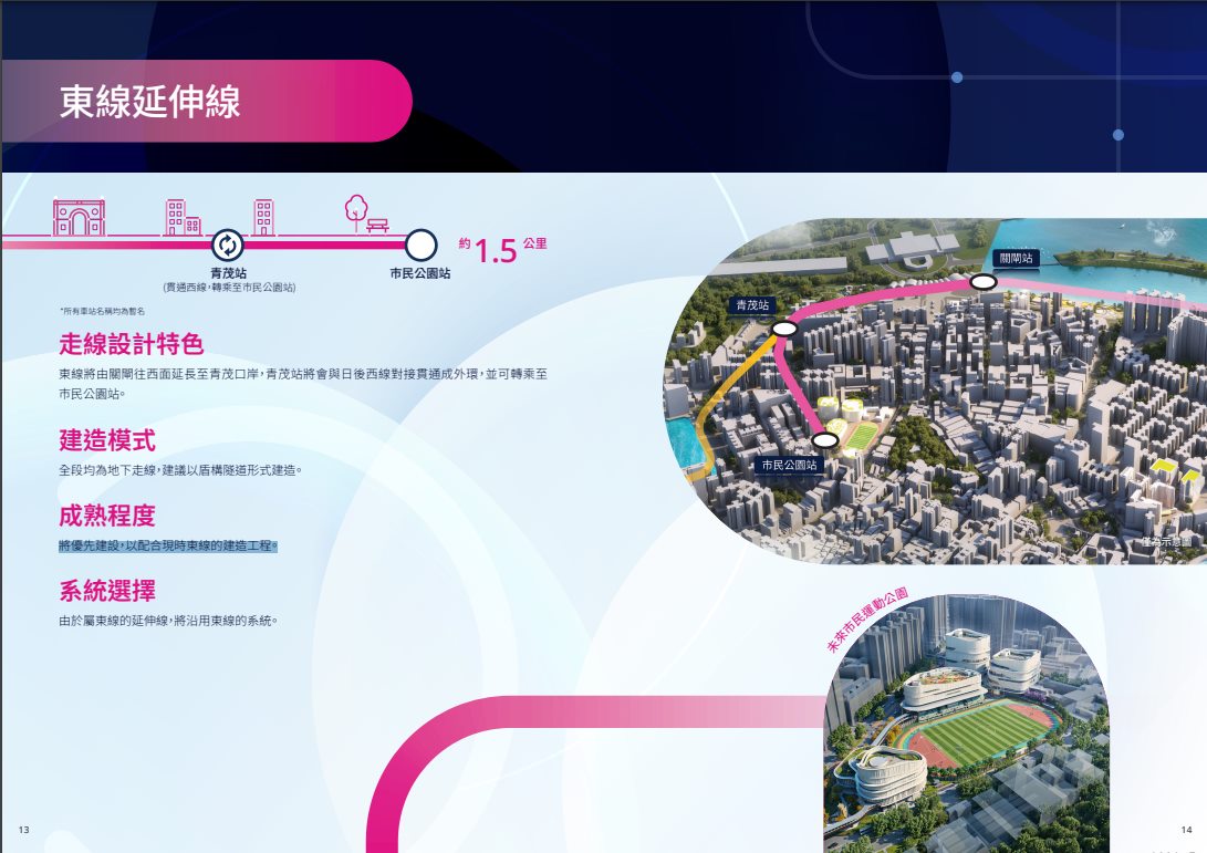 東線將由關閘往西面延長至青茂口岸,青茂站將會與日後西線對接貫通成外環,並可轉乘至巿民公園站。全段均為地下走線,建議以盾構隧道形式建造。建議優先建設,以配合現時東線的建造工程。