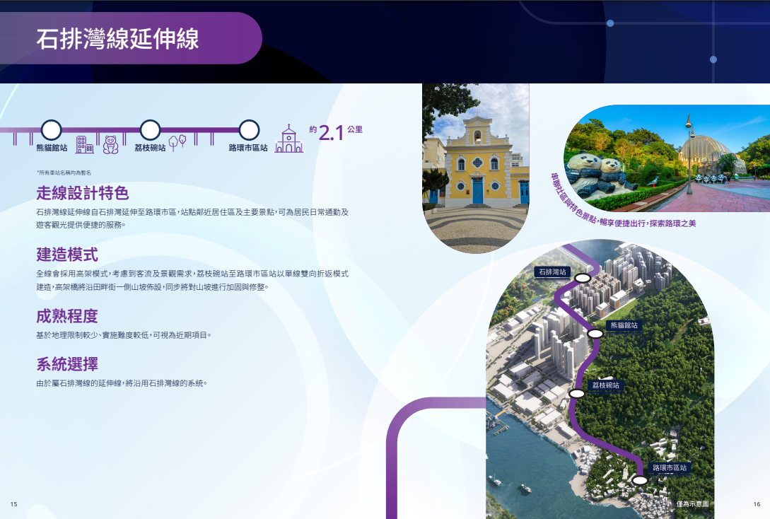 石排灣線延伸線自石排灣延伸至路環市區,分別停靠熊貓館站、荔枝碗站,站點鄰近居住區及主要景點,可為居民日常通勤及遊客觀光提供便捷的服務。全線會採用高架模式,考慮到客流及景觀需求,荔枝碗站至路環市區站以單線雙向折返模式建造,高架橋將沿田畔街一側山坡佈設,同步將對山坡進行加固與修整。基於地理限制較少、實施難度較低,可視為近期項目。
