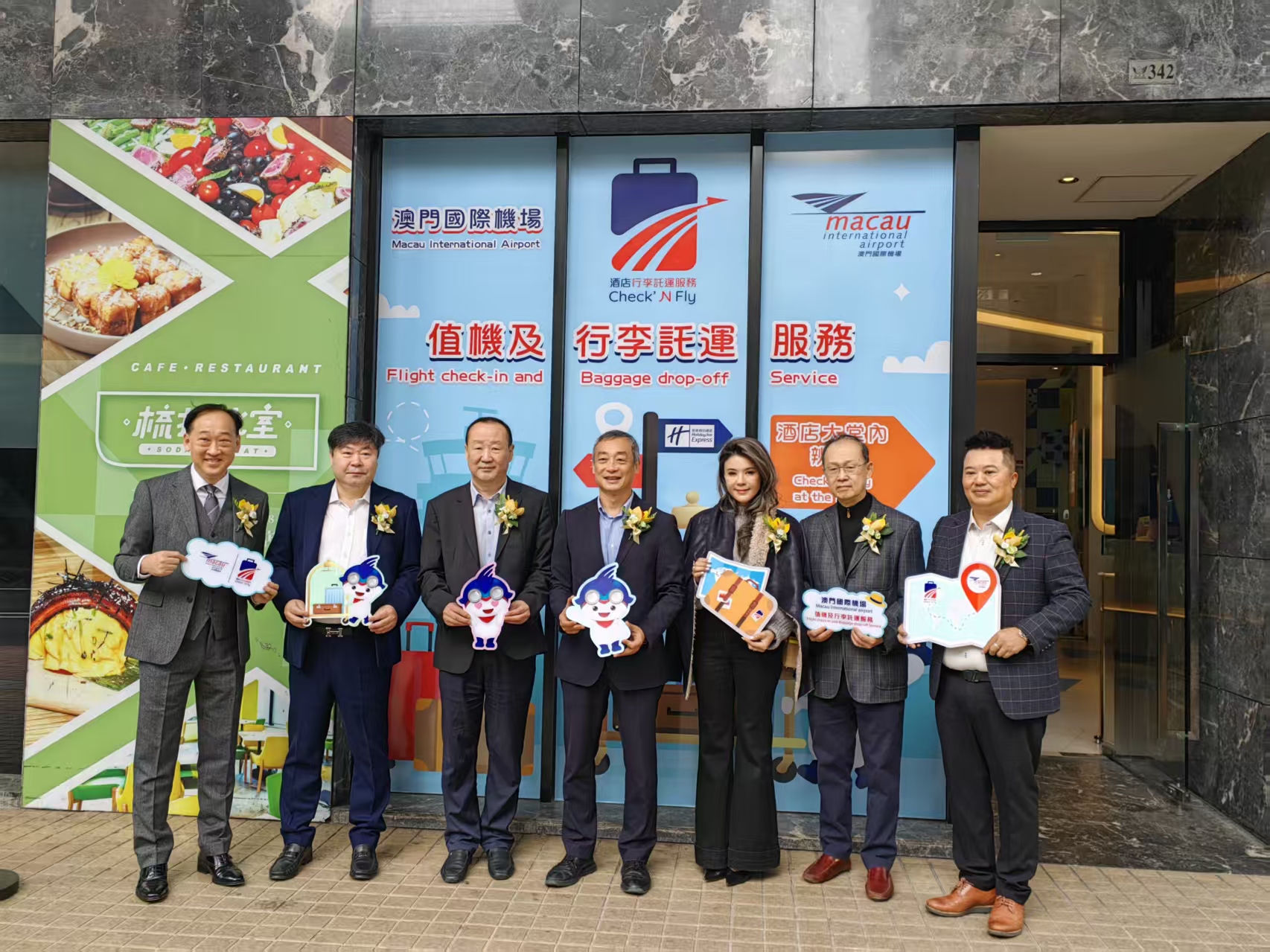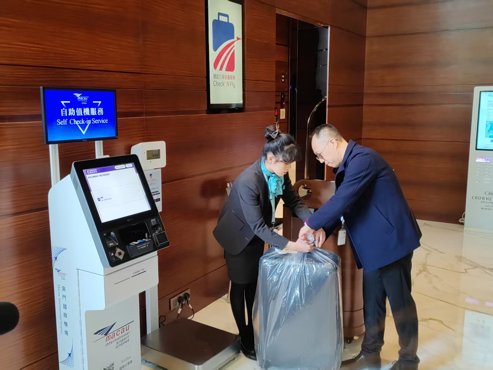 澳門國際機場上午分別在新口岸智選假日酒店及澳門皇冠假日酒店大堂舉行酒店行李託運服務啟動儀式,並介紹酒店行李託運服務相關設施,以及營運安排。澳門國際機場專營股份有限公司執行委員會主席陳穎雄,澳門航空股份有限公司董事會主席兼執行委員會主席兼總經理吳立新,明捷澳門機場服務有限公司總經理巴安娜,澳門國際機場專營股份有限公司執行董事朱丹寧、李時泰,澳門新口岸智選假日酒店總經理鍾友雄,澳門皇冠假日酒店市場銷售副總監吳維彬,澳門國際機場專營股份有限公司市場部總監方曉健等出席。