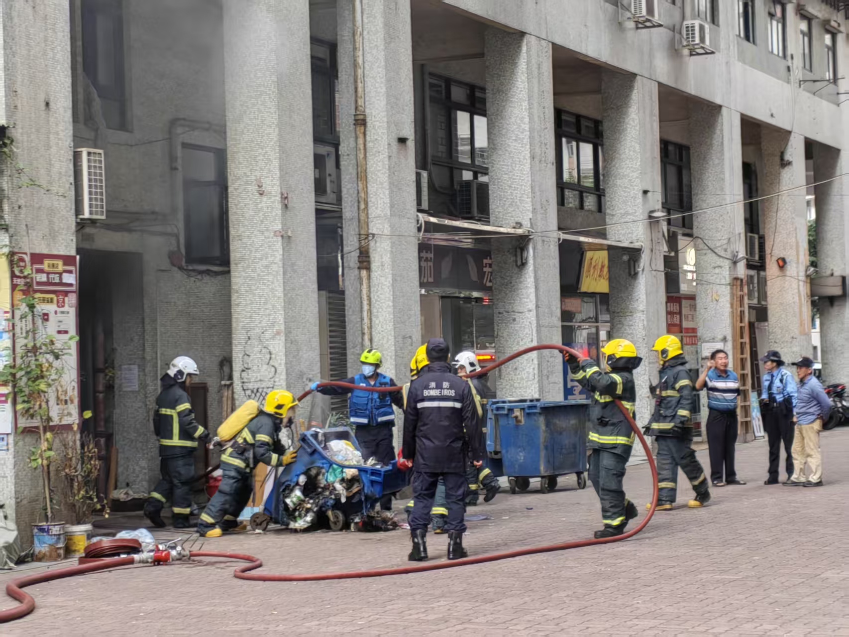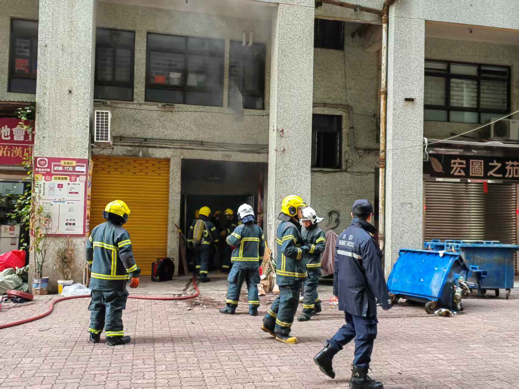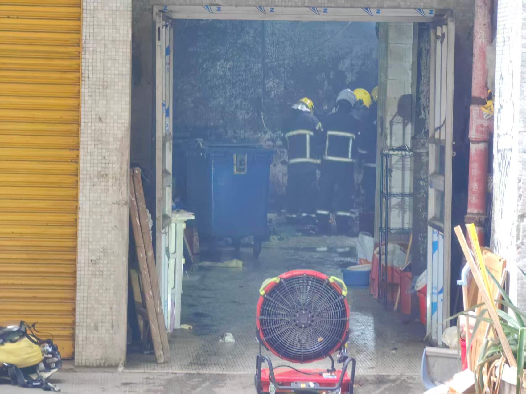 消防員將一個嚴重燒燬變形的塑膠垃圾箱移至大廈旁邊的空地。該垃圾箱部分已融化焦黑,露出內部雜物。消防員其後在垃圾房門口架設抽風機,將垃圾房內積聚的濃煙抽出,並進入現場搜索,確保無餘火復燃風險。