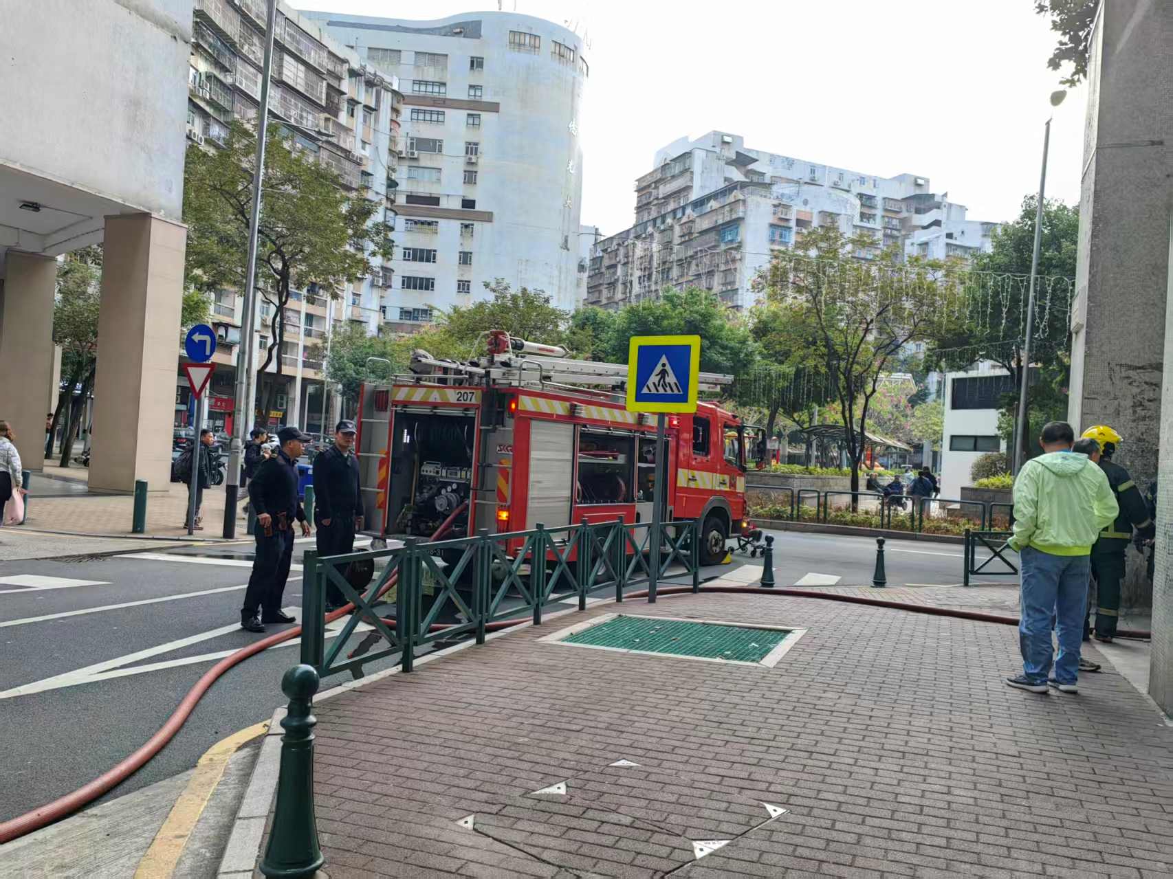 現場可見,四輛紅色消防車已在菜園路附近就位,有警員在現場維持秩序,多名消防員在現場佈防及整理裝備。不少居民聞訊到場圍觀。