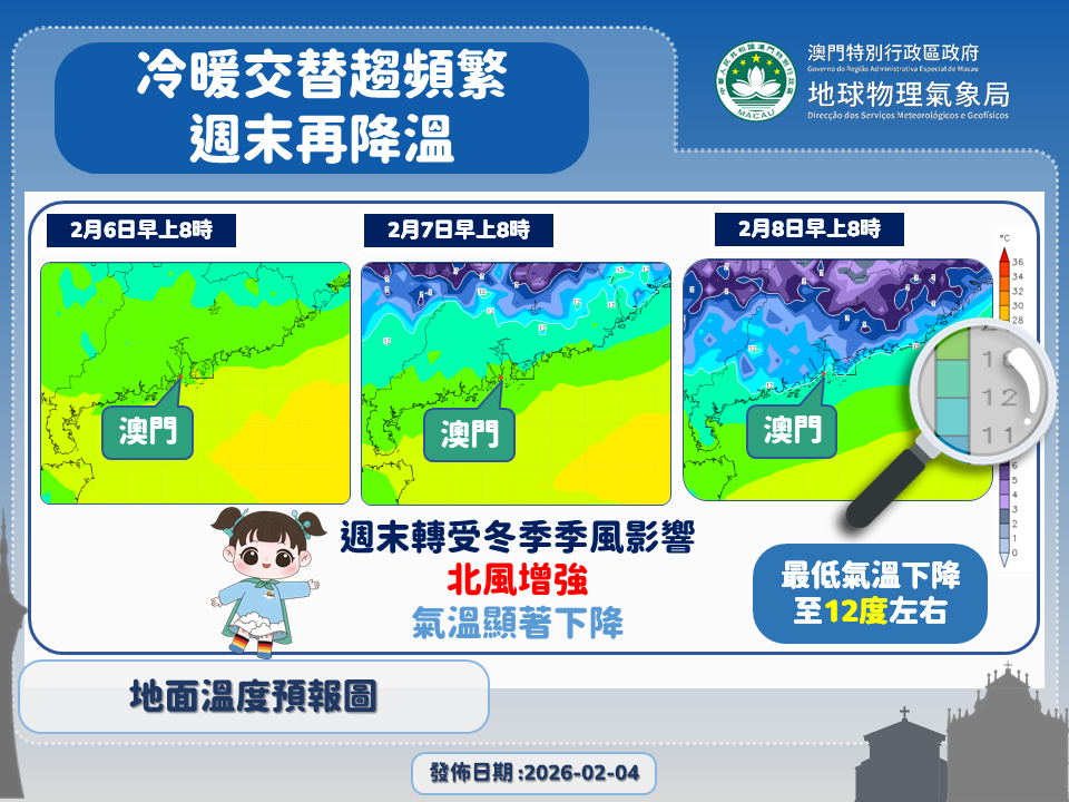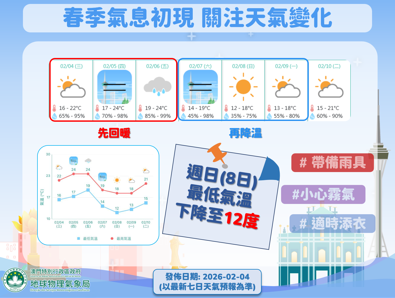 預料本周末(7 至 8日)轉受冬季季風影響,北風增強,氣溫顯著下降,周日(8日)最低氣溫下降至12度左右,天氣漸轉晴朗乾燥,但風力較大使得溫度體感寒冷,周末外出時應帶備厚衣,防範早晚氣溫起伏。
