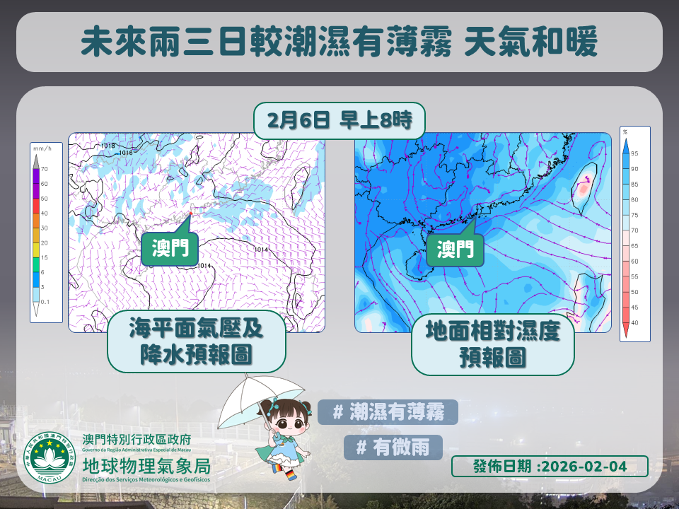 氣象局預料今日稍後至周五(4 至 6日)受暖濕偏東氣流影響,氣溫和濕度逐步上升,整體感覺較和暖。周四(5日)至周五( 6日)有薄霧或霧,有幾陣微雨,能見度較低。駕駛人士要注意路面安全,小心濕滑。