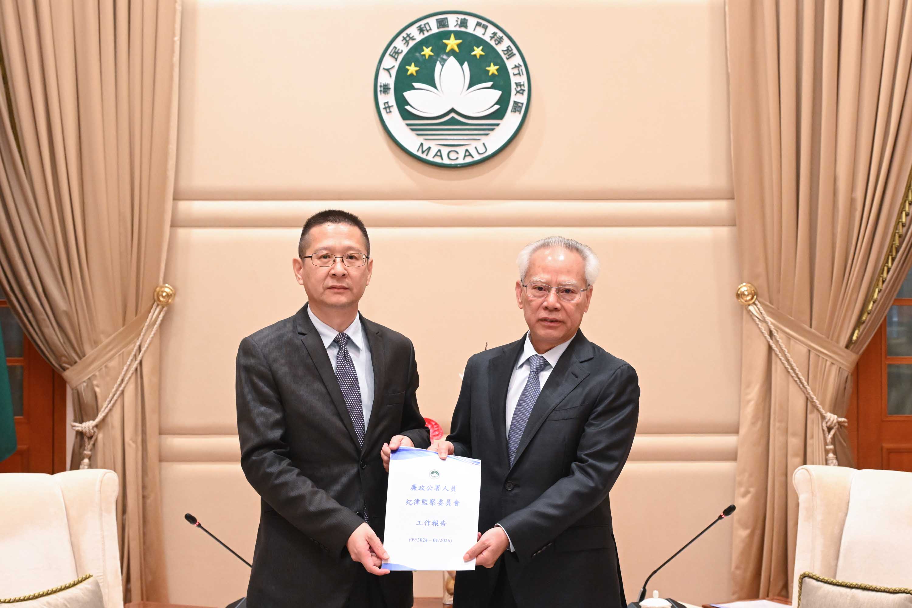 廉政公署人員紀律監察委員會主席王禹向行政長官提交了工作報告,並與其他委員共同匯報過去一年的工作情況,以及就提升監察效能提出方向性建議。