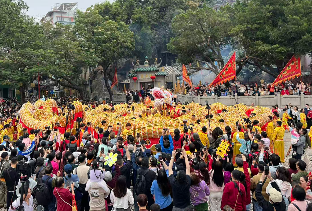 隨後,大金龍巡演隊伍沿東方斜巷、崗頂、龍嵩街、擺華巷、政府總部、卑第巷、聖老楞佐教堂、亞婆井前地、媽閣街,最後抵達媽閣廟。大金龍沿途與居民和旅客互動,祝願大家新的一年龍馬精神、福氣滿滿。