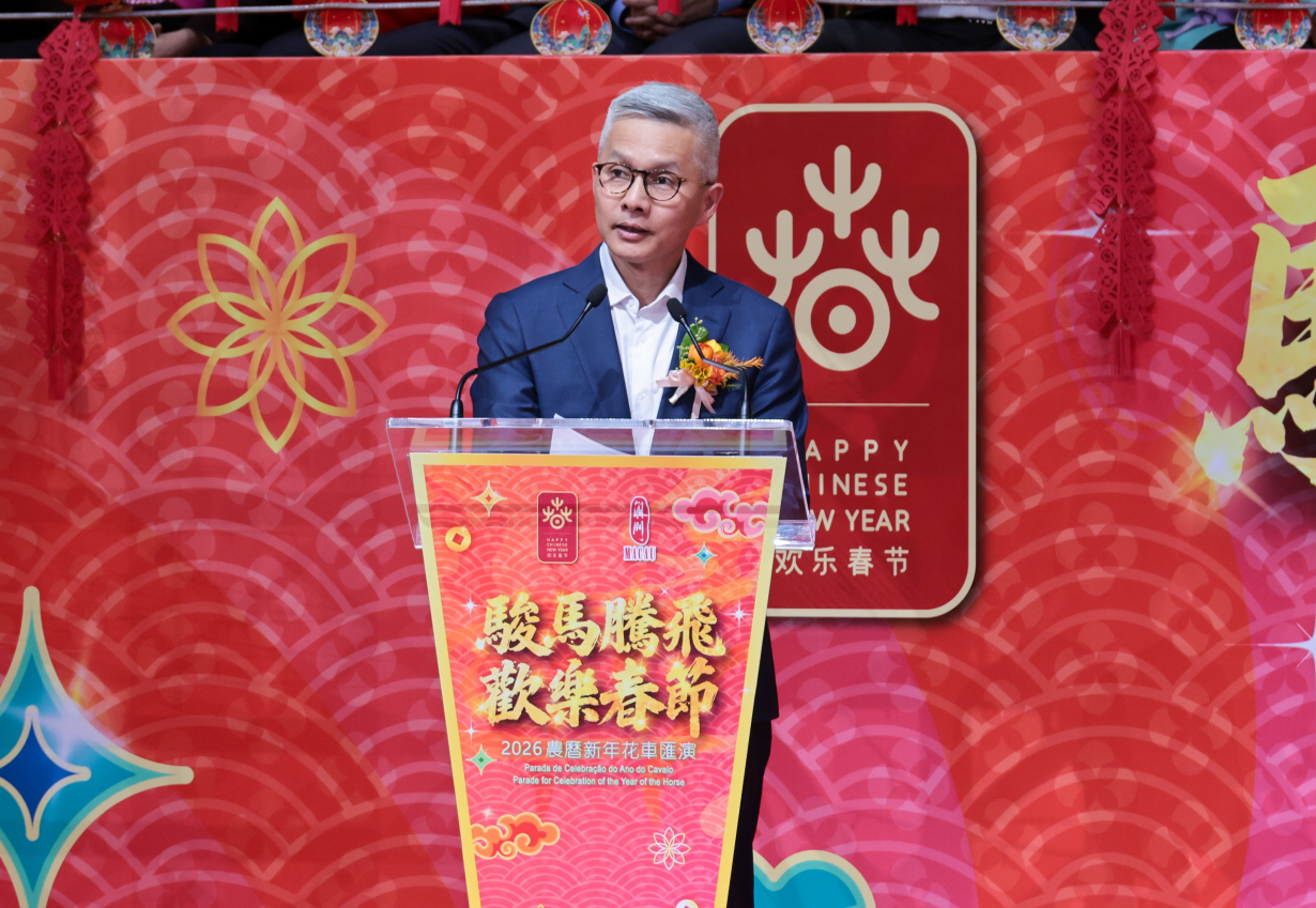 經濟財政司司長戴建業致辭時表示,2026年是國家“十五五”規劃的開局之年,澳門特區將繼續推進綜合旅遊休閒業高質量發展,加快推動經濟適度多元,以積極作為的態度主動對接“十五五”規劃,更好地融入和服務國家發展大局。在建設世界旅遊休閒中心的過程中,澳門琳瑯滿目的盛事和節慶匯演一直載譽國際。今年,花車匯演以“駿馬騰飛”為主題,寓意澳門在祖國的堅強領導和有力支持下,像駿馬一樣奮發向前、騰飛發展,開創繁榮穩定的新篇章。特區政府將繼續與社會各界攜手並肩,致力推動經濟適度多元和高質量發展,鞏固提升世界旅遊休閒中心地位,展現澳門獨特的旅遊魅力。