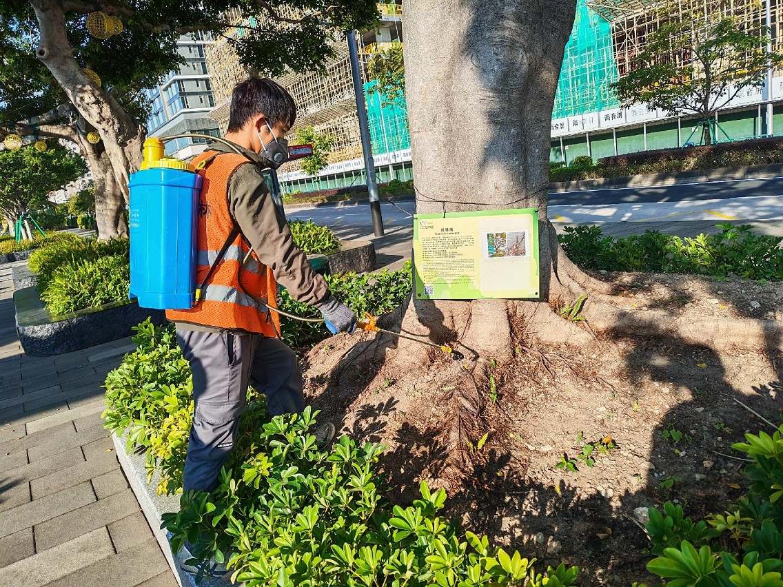 【即時新聞】市政署持續巡查及護理各區街道樹木,以維護樹木健康及公眾安全。樹木養護人員經巡查發現觀音像海濱休憩區兩株榕樹感染褐根病,正持續進行救治並已掛上告示牌,讓市民知悉樹木狀況。
