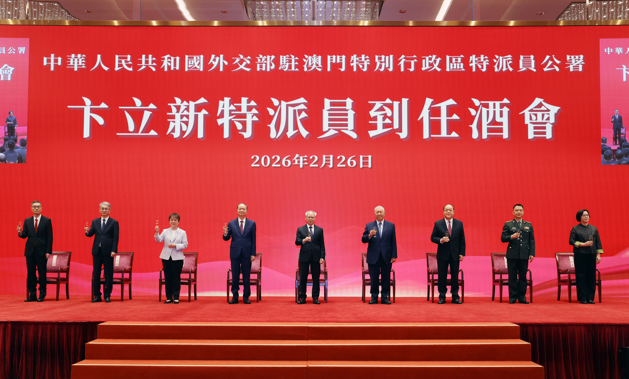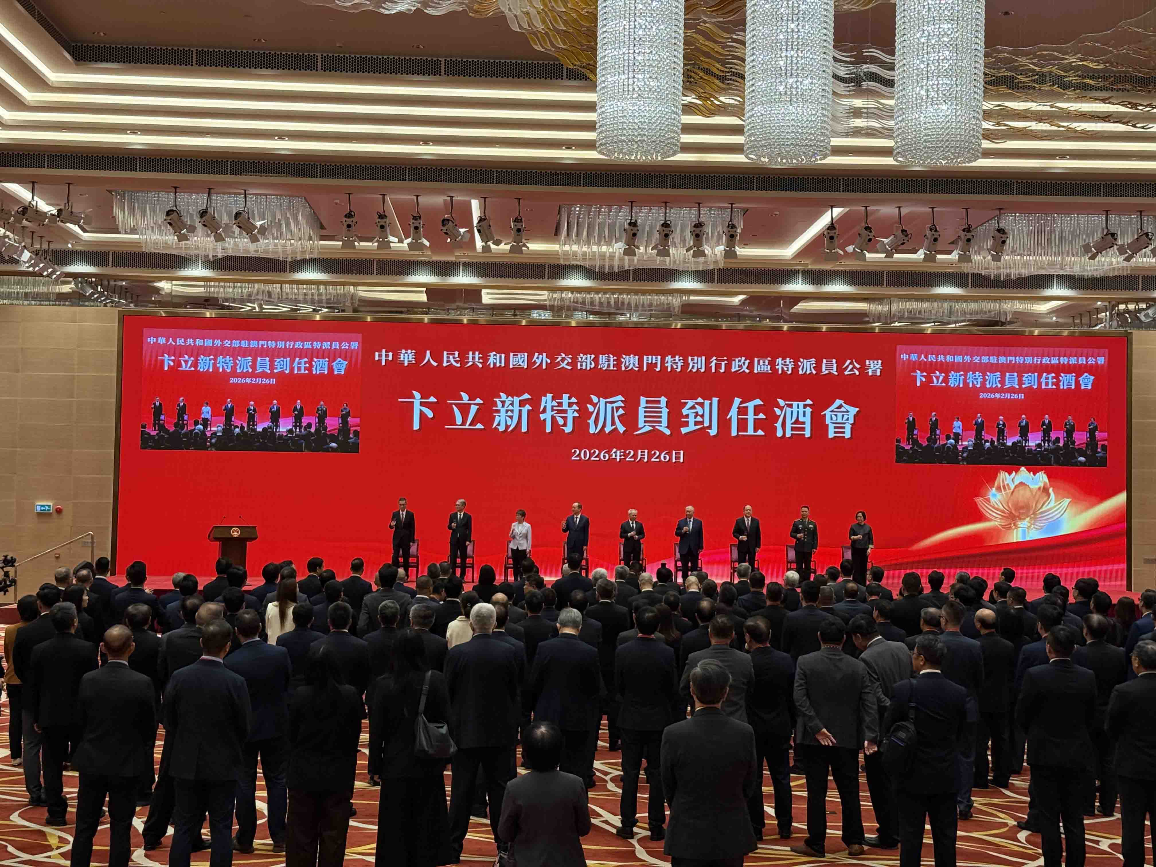 【即時新聞】外交部駐澳門特派員公署特派員卞立新到任酒會於今日下午在中葡綜合體舉行,行政長官岑浩輝、全國政協副主席何厚鏵、中聯辦主任鄭新聰、前行政長官賀一誠、駐澳門部隊副司令員戴勁松、澳門立法會主席張永春、澳門終審法院院長宋敏莉、特區政府主要官員、行政會委員、立法議員、外國駐澳領事機構負責人、澳門各界知名人士和中資企業代表等近500人出席。