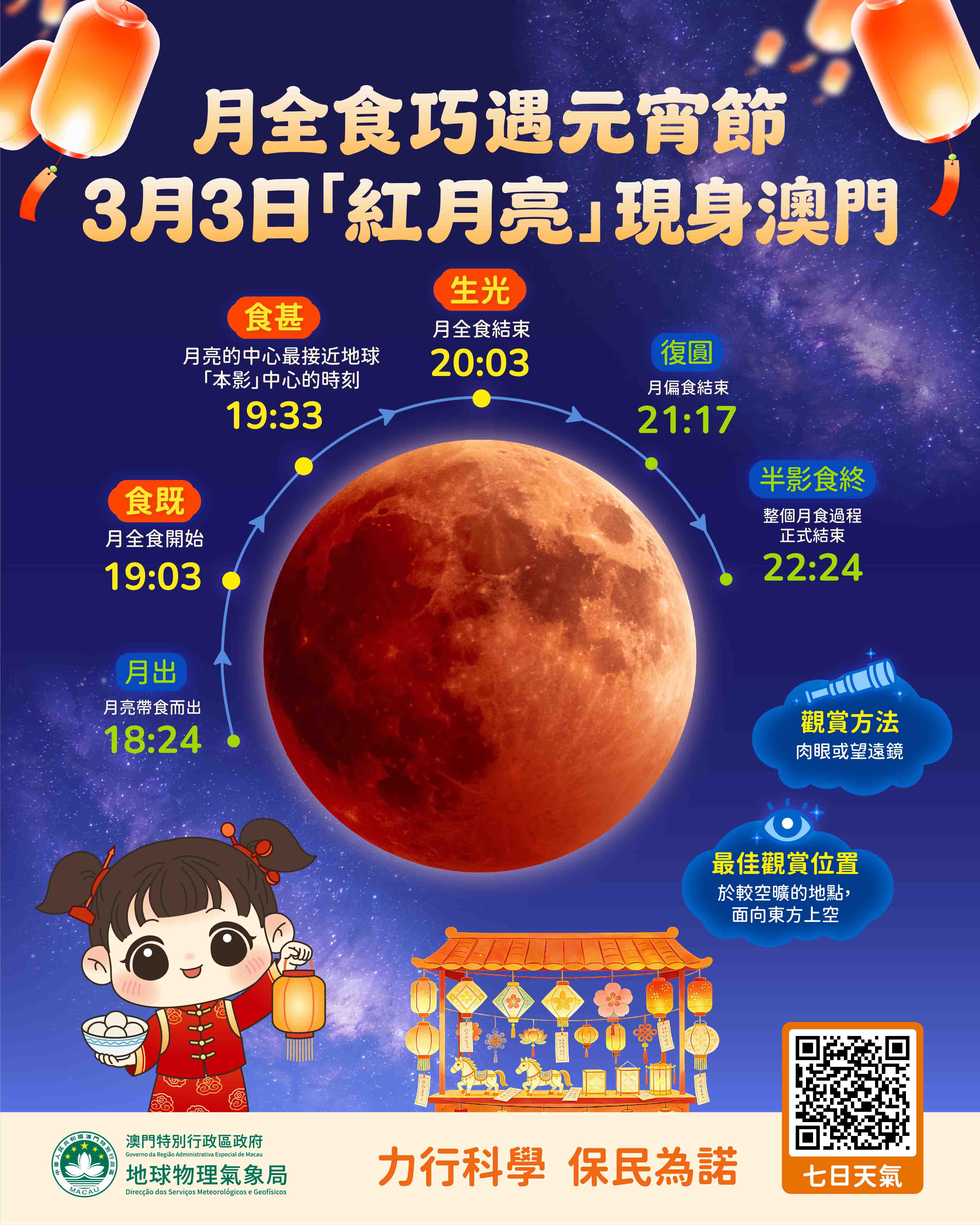 【即時新聞】澳門將於明日(3月3日)傍晚出現「月全食」天文現象。當天適逢農曆正月十五元宵佳節,市民可於節日晚間觀賞到「紅月亮」,為團圓日子增添天文色彩。