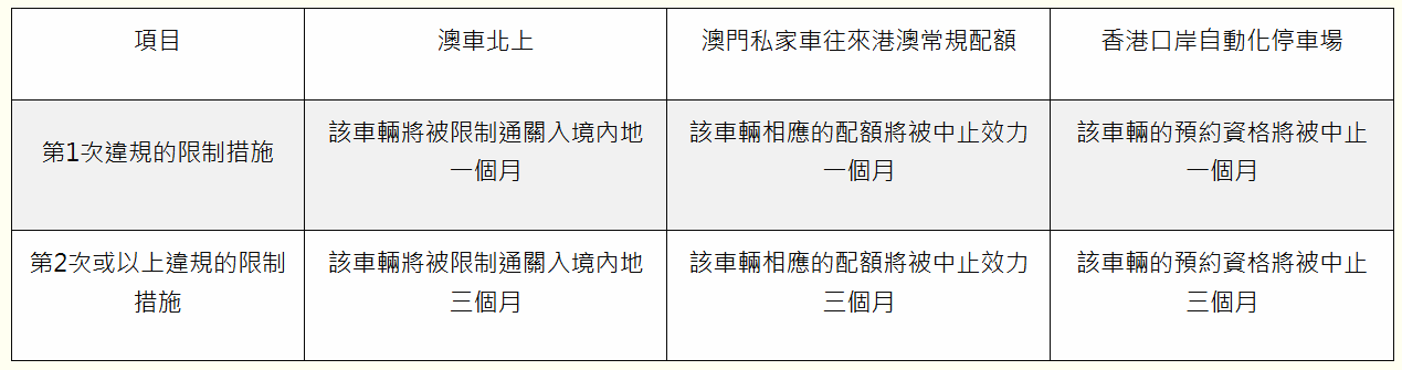 如發現配額車輛在未有遵循“澳車北上”的預約規則下進入內地,首次違反,該車輛相應的配額可被中止效力一個月,續後的每次違反,該車輛相應的配額可被中止效力三個月。