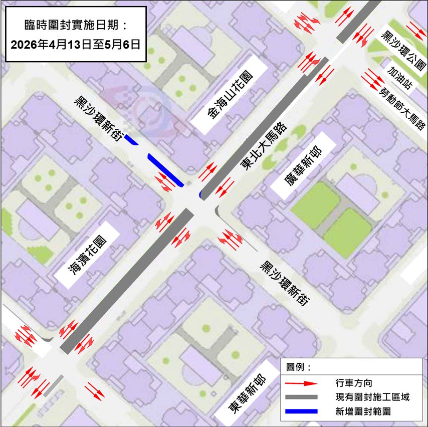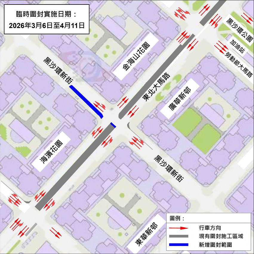 為此,公共建設局與交通事務局經協調後,預計由2026年3月6日起,分三階段對海濱花園與金海山花園之間的一段黑沙環新街(近東北大馬路區域)進行局部圍封,並實施有限度通車,以保障東北大馬路與黑沙環新街交匯處至少保持雙線行車。