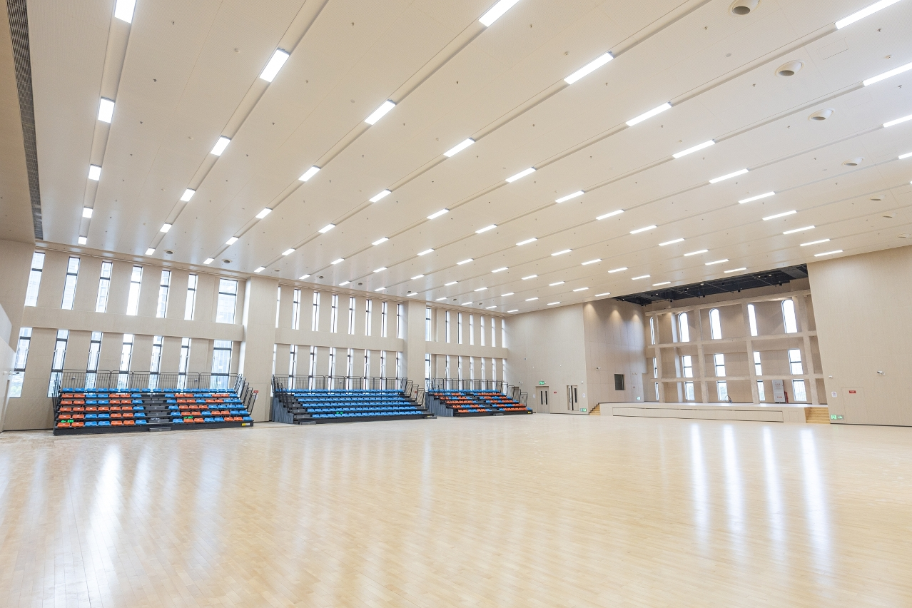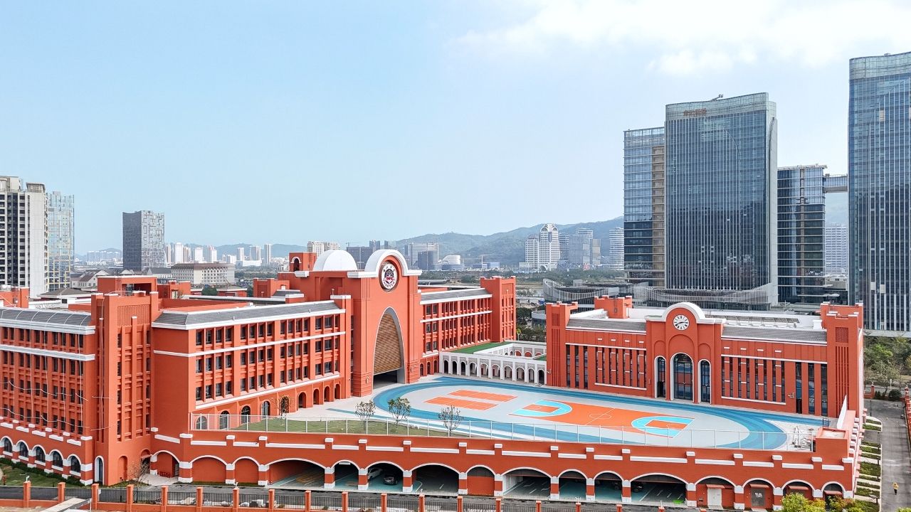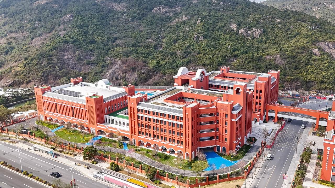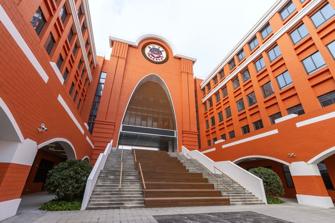 中學延續幼稚園和小學校舍的古典端莊歐式建築風格,並巧妙運用地形特點,採用向北側山體打開的佈局,使校園空間感更廣闊,打造「融景入園」、綠意盎然的優質校園,讓莘莘學子在優美環境中學習成長。