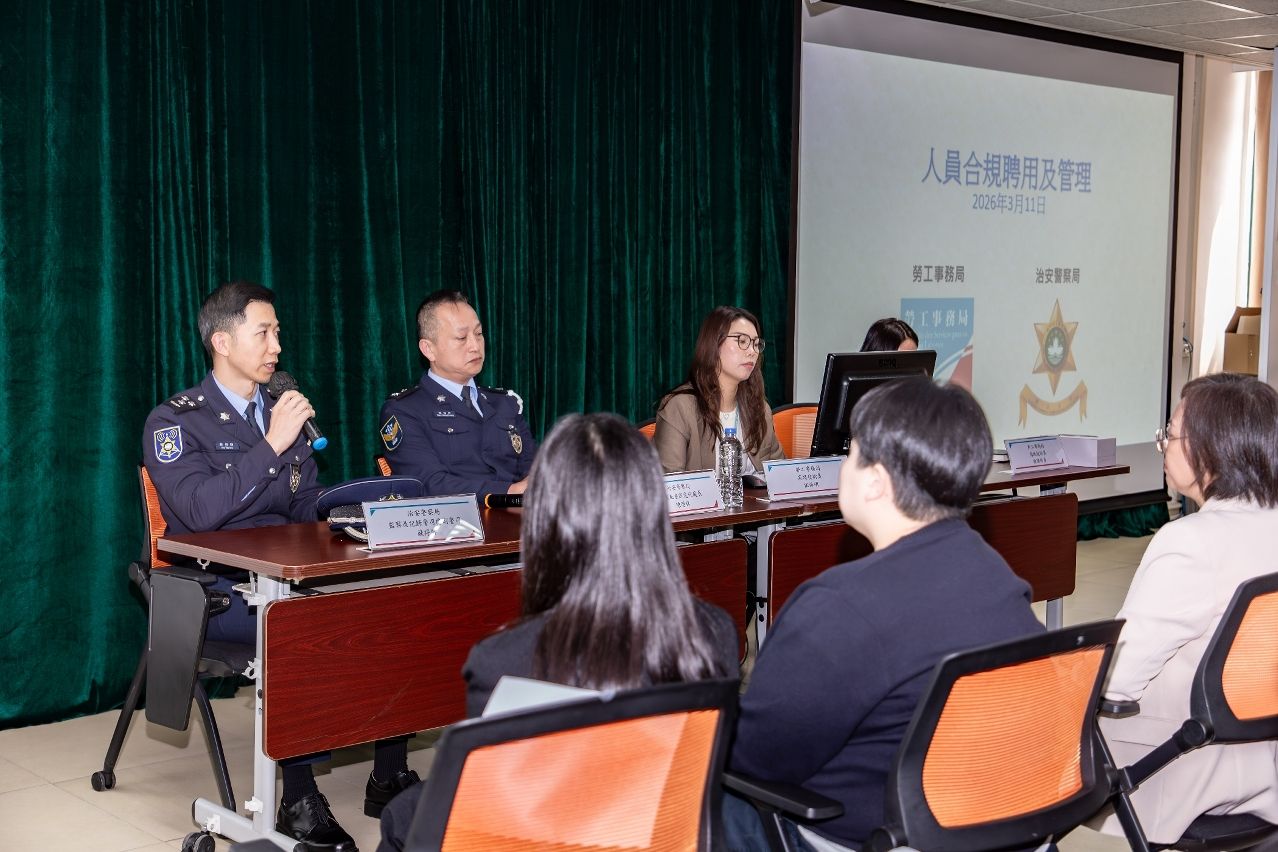 是次講解會主要對象為綜合度假休閒企業代表,吸引逾80名業界人士出席。講解會涵蓋活動籌辦、人力資源及相關合規聘用和管理等主題內容,勞工局代表詳細解說《禁止非法工作規章》及《聘用外地僱員法》的主要條文及適用範圍等法規內容,並說明行業聘用合規管理要點;治安警代表則講解如何辨識及預防不合規聘用的情況,並介紹持份者間的監管協作機制。