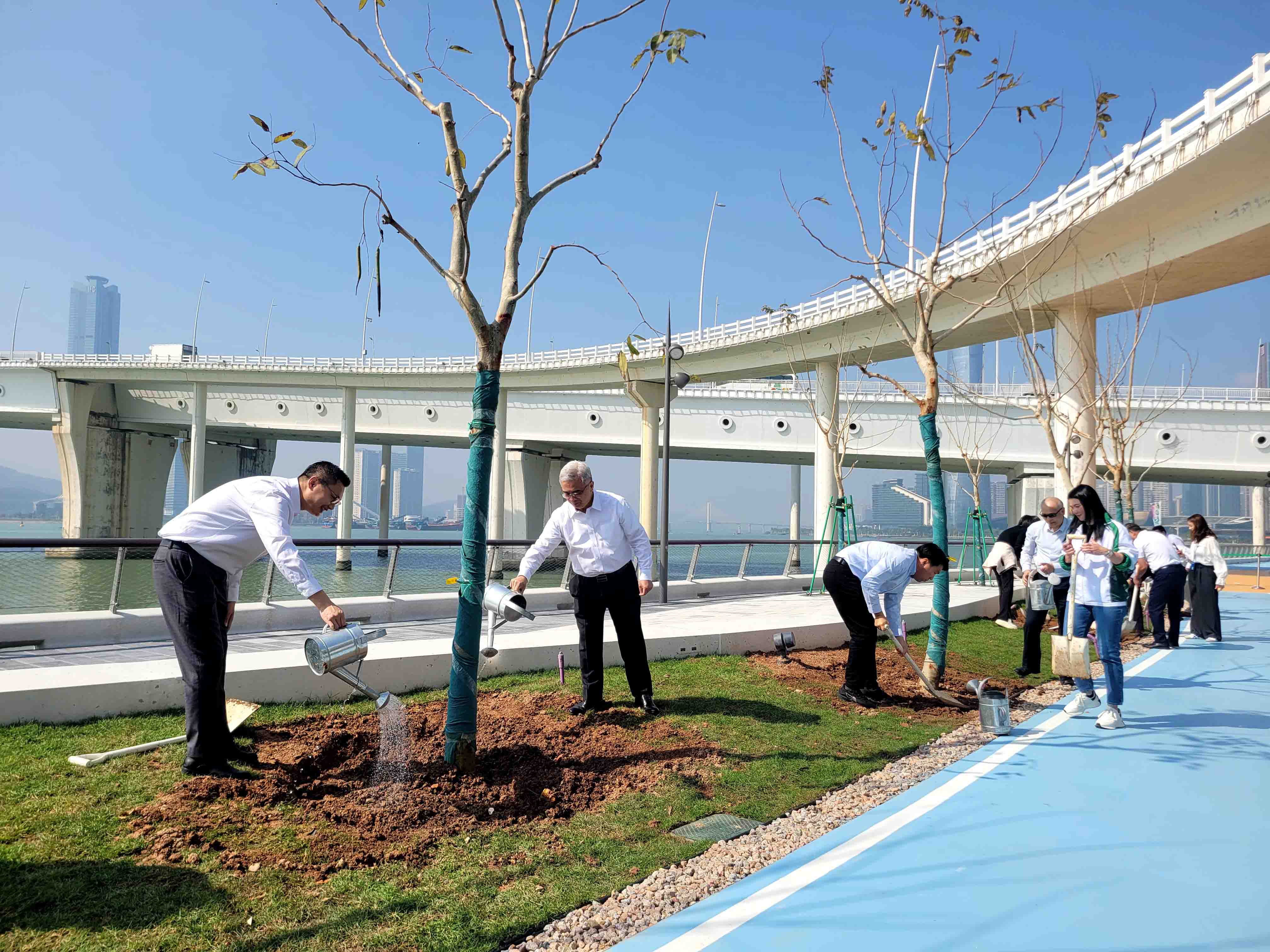 【即時新聞】為響應3月12日中國植樹節,市政署於南岸海濱綠廊舉辦植樹活動,行政法務司司長黃少澤、司長辦公室主任曾翔、市政署市政管理委員會主席周偉迎、市政諮詢委員會主席許樂敏等嘉賓聯同近 60名師生,一起種植苗木以美化澳門海岸,共同倡導“愛綠、植綠、護綠”的理念。