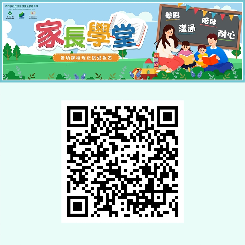 “家長學堂”透過以“3+2”主題作為課程框架,由母親懷孕、嬰兒出生、兒童期及青少年期分為四個成長階段,每個階段設有能力發展、家庭關係、身心健康共3個共同核心主題,以及按子女年齡成長特質而設定的2個主題,讓家長具體了解育兒策略和技巧,幫助家長面對兒童成長的各種挑戰,有效建立正向親子關係,營造和諧家庭氛圍。“家長學堂”將持續提供線下課程,並精選熱門課程於網上直播,以及陸續把直播課程的重點,剪輯成精華片段或製作圖文包供家長重溫,讓家長不受時間及地點限制獲得實用教養資訊。歡迎家長掃瞄二維碼或登入:https://portal.dsedj.gov.mo/webdsejspace/site/pare... 瀏覽更多“家長學堂”資訊。