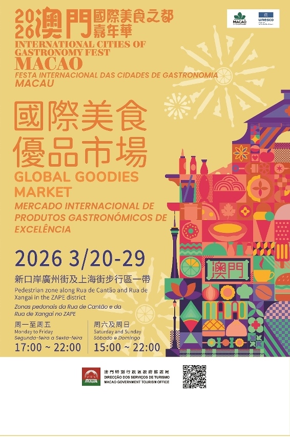 “2026澳門國際美食之都嘉年華”於3月20至29日舉行,主會場選址新口岸區的澳門漁人碼頭羅馬廣場及勵駿大道,首次設置的分會場則位於廣州街及上海街一帶。來自全球近40個聯合國教科文組織“創意城市美食之都”的代表聯同10個來自海內外其他範疇創意城市的代表、專家學者、澳門旅遊業及餐飲業界,合力擦亮“國際美食大道”、“美食之都廚藝展示”、“澳門國際美食論壇”以及全新登場的“環球美酒廊”和“國際美食優品市場”,打造全方位的美食與交流體驗。