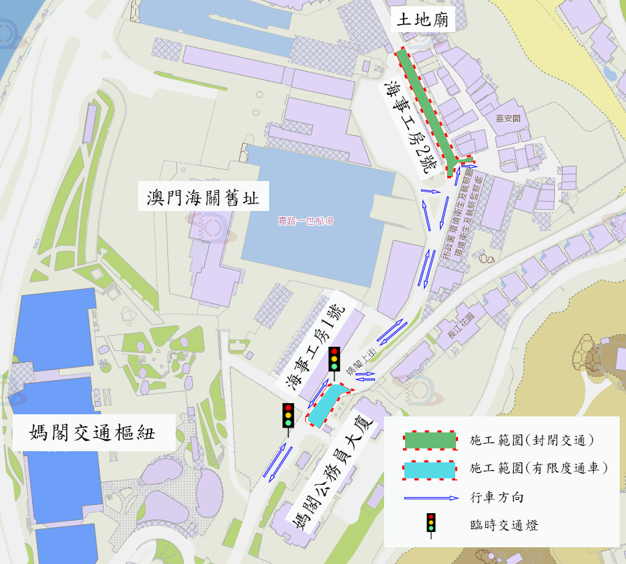 【即時新聞】媽閣上街下水道及道路重整工程主路段施工於3月21日至7月中旬展開,施工路段將建造清污分流排水管,鑒於現有地下管線密集及新建排水管位處行車道中間,施工期間媽閣上街近土地廟及海事工房2 號的行車道將實施封閉施工,其餘路段則在交通燈號控制下作有限度通車。
