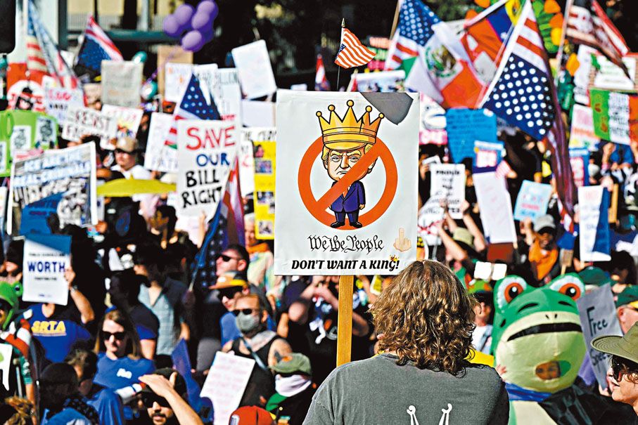 洛杉磯約10萬民眾在市中心舉行抗議活動。抗議者揮舞著美國國旗,手持標語牌,批評特朗普政府當前執行的移民政策、經濟政策、對外政策以及非法擴展行政權力的行為。59歲的抗議者比利·布朗接受記者採訪時說:“曾經,這是一個讓我們所有人都引以為傲的國家。而如今,我們已淪為全世界的笑柄。 ”