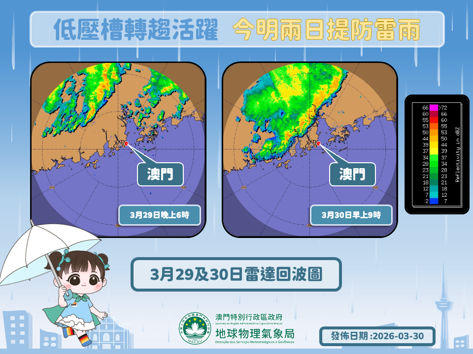 【即時新聞】本澳過去數日受偏南氣流影響,氣溫持續上升,驟雨及雷暴亦開始增多,冬季氣息基本已消退。受暖濕偏南氣流及低壓槽影響,廣東內陸近日接連出現雷雨。隨著低壓槽移近,預料今明日兩日本澳驟雨增多,有幾陣雷暴。