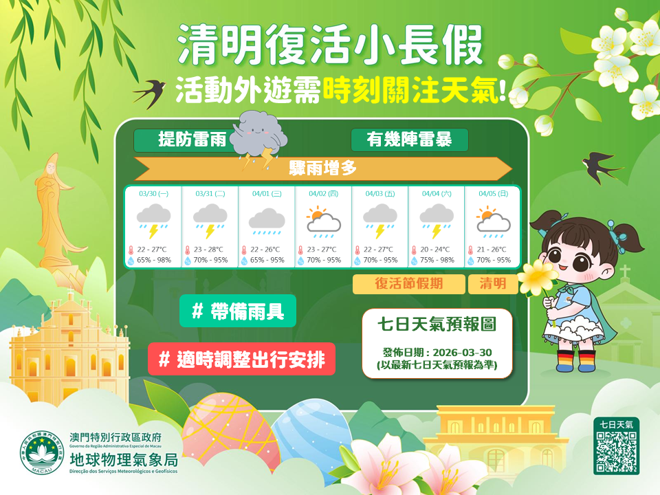 展望清明及復活節小長假(4月3至6日)期間,間中有驟雨及幾陣雷暴,市民如計劃外出,請留意天氣,帶備雨具或適時調整行程。但由於預報時間較長,低壓槽實際影響範圍及強度仍有一定不確定性。